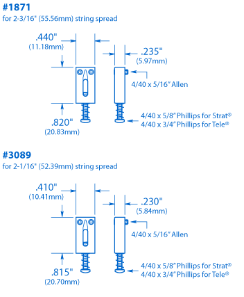 | #1871 | Para Strat y Tele 7/16" x 13/16" x 1/4" (11,18 mm x 20,83 mm x 5,97 mm) Incluye tornillos Allen de ajuste de altura de 5/16" Incluye tornillos de entonación de 5/8" para Strat y tornillos de 3/4" para Tele Fits Strat/Tele con espaciado de cuerdas de 2-3/16" (55,56 mm) en el puente |