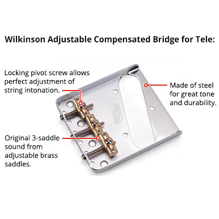 ¡Por fin, un puente de 3 silleta que se puede ajustar para que juegue en sintonía! Un tornillo pivotante de bloqueo en el centro de cada silleta permite un ajuste perfecto de la entonación de cuerda.