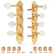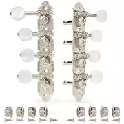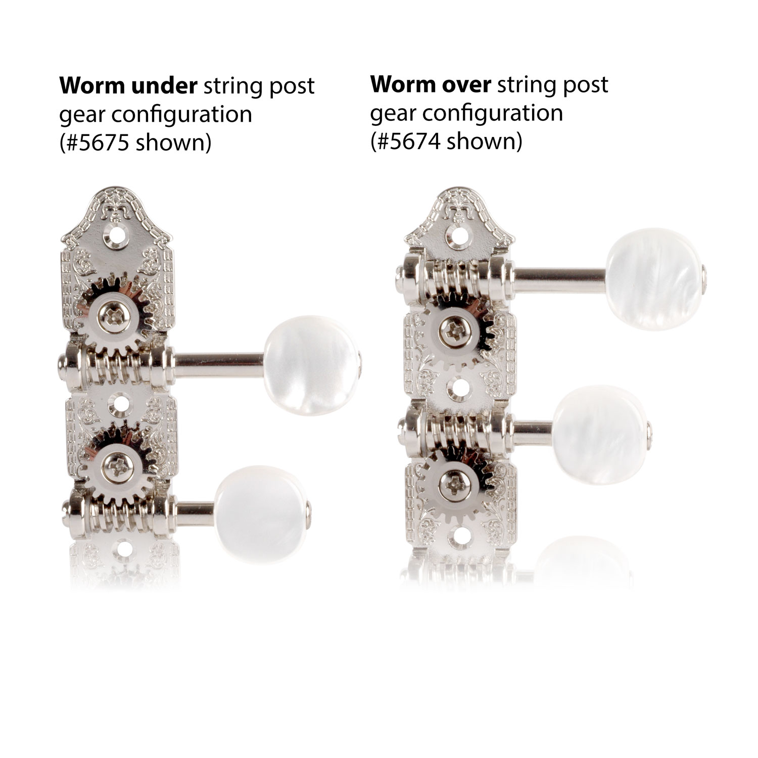 Los clavijeros de mandolina estilo F Grover están disponibles en dos configuraciones de engranaje diferentes, con placas base de fundición a presión grabadas y relación 18:1 de engranaje.