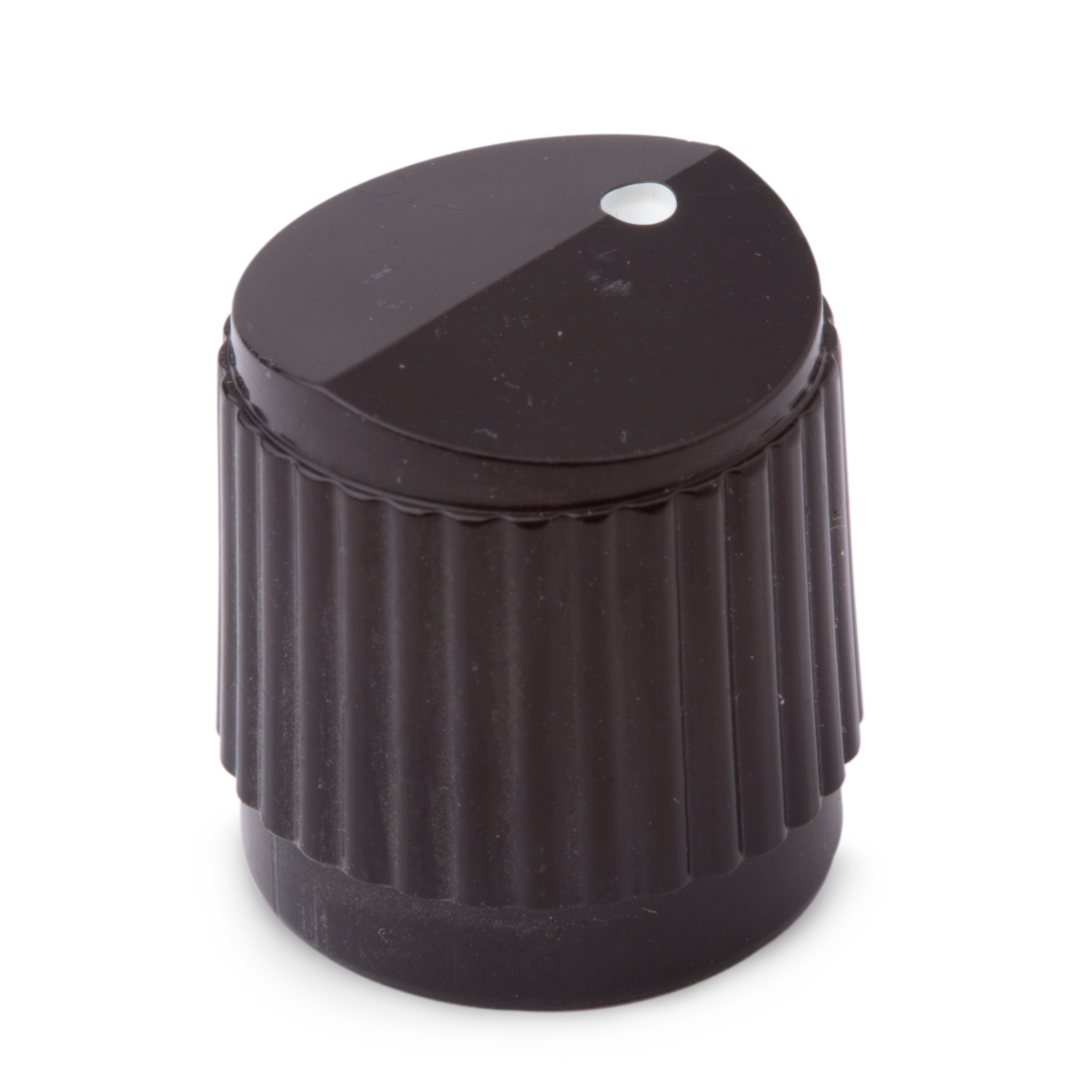 18,26 mm (23/32") de diámetro, 19,84 mm ( 25/32") de alto. Se trata de una perilla de ajuste a presión para ejes de potenciómetro moleteados gruesos (Alpha). Plástico negro. Se vende por separado.