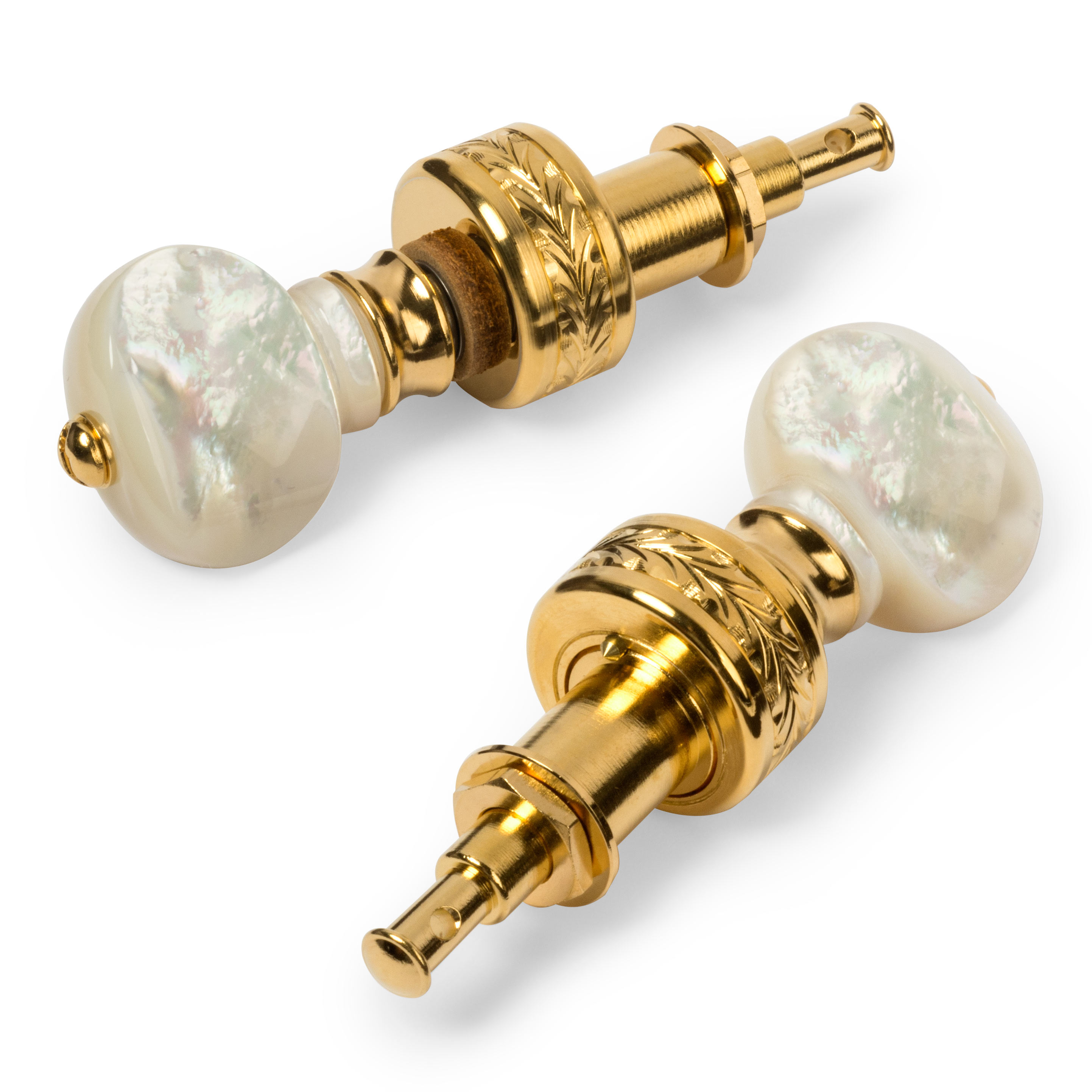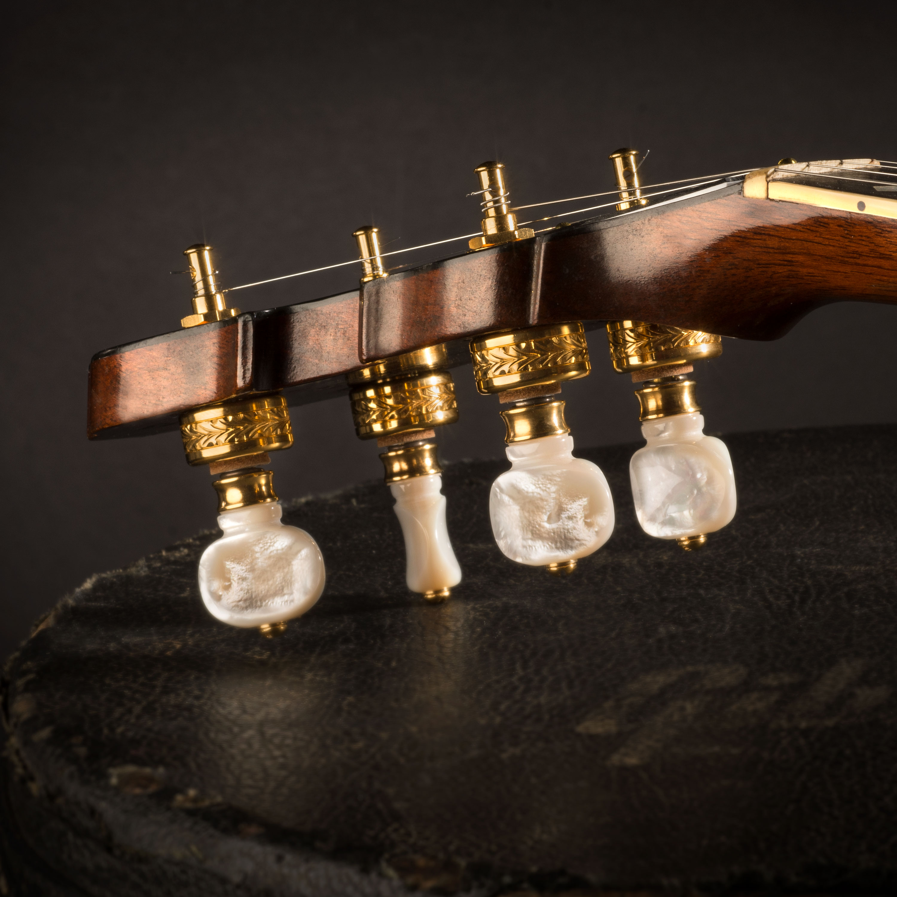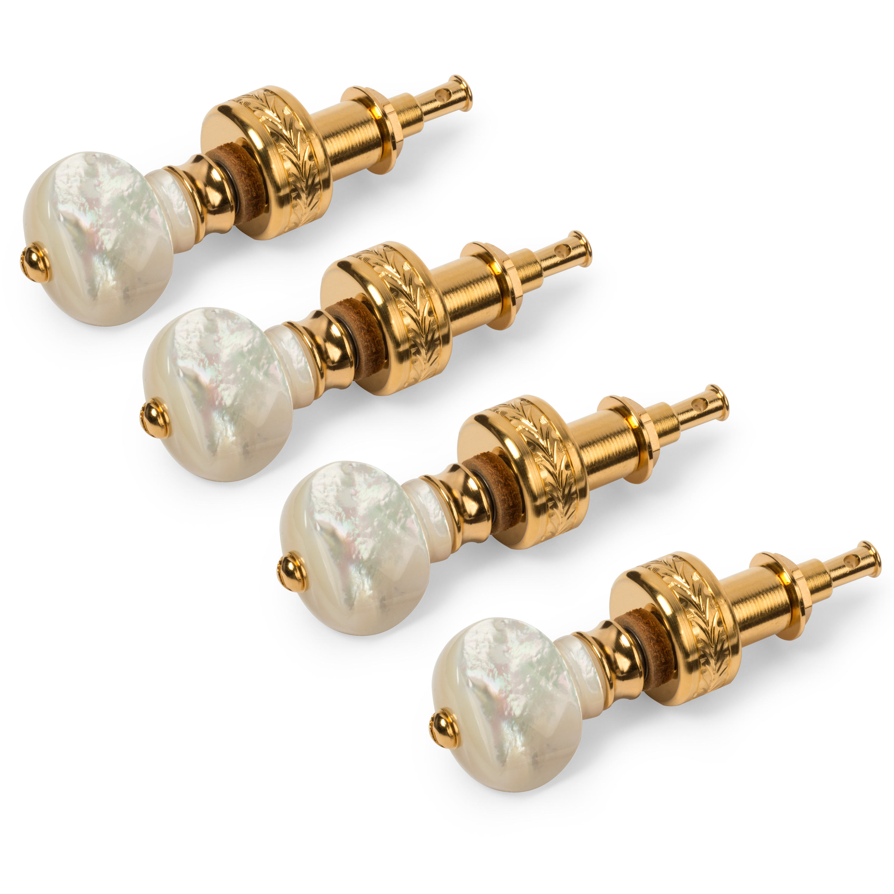 Los mejores clavijeros planetarios. El estilo Waverly vintage se combina con detalles de lujo en toda la prenda: acabado chapado en oro, grabado a mano, tensión de perilla ajustable y botones de nácar auténtico. Los engranajes 1:4 de relación de precisión con lubricación sellada garantizan un funcionamiento suave y sin esfuerzo con juego CERO. Producido originalmente para Martin y instalado en fábrica en su guitarra modelo OM-45 De Luxe Authentic 1930 de 100,000 USD.