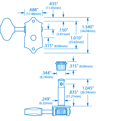 Cada sintonizador cuenta con una relación de 18:1 engranajes para un ajuste fino, una placa base fundida, perillas escalopado de estilo vintage, rodamientos de gusanos de nailon y tornillo de tensión para un funcionamiento suave.Juegos de 6 (3 izquierda/3 derecha). Cada juego incluye tornillos de montaje y casquillos de pala de ajuste a presión estriados. Se requieren orificios de clavijero de 11/32" (8,73 mm) de diámetro.