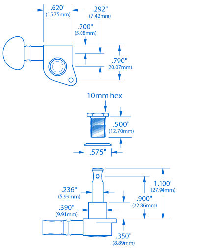 Los clavijeros de tamaño mediano Rotomatic® cuentan con perillas metálicas extraíbles compactas con tensión ajustable, lubricación sellada de por vida y relación 18:1 de cambio para un ajuste fino.