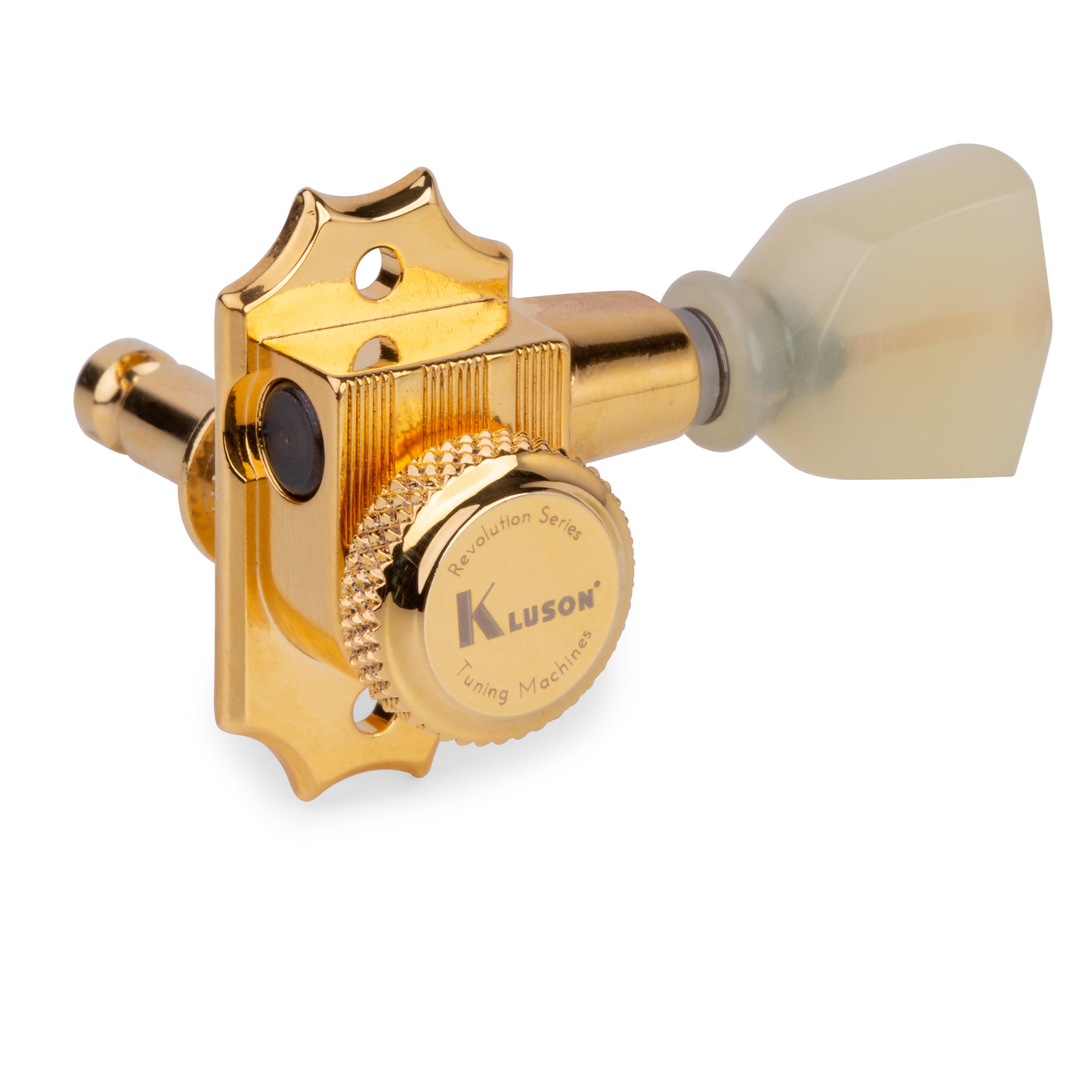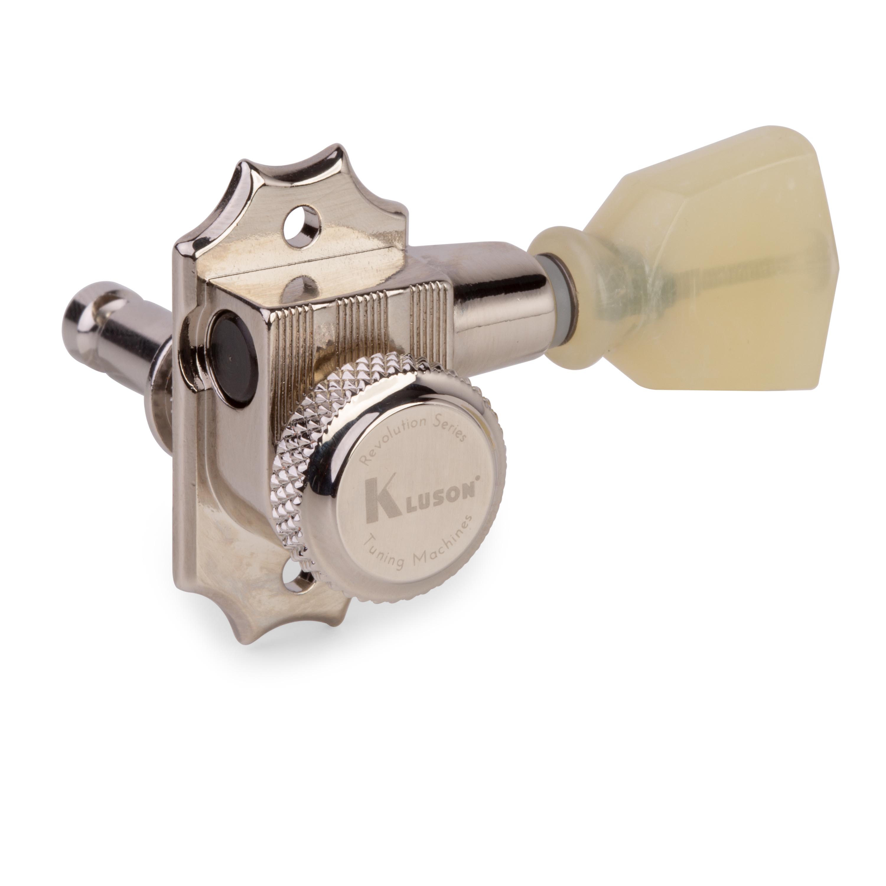Máquina de ajuste de montura G de 19:1 alta relación Kluson Revolution. Kluson ha introducido realmente un revolucionario sistema con la huella tradicional y la carcasa de fundición a presión sellada de nuevo diseño. Estos clavijeros de última generación están diseñados para reajustar directamente clavijeros vintage con un casquillo de ajuste a presión y añadir un mecanismo de bloqueo de perilla trasera, un patrón de montaje tradicional de dos tornillos Kluson y un orificio para tetones vintage de 11/32" (8,8 mm).