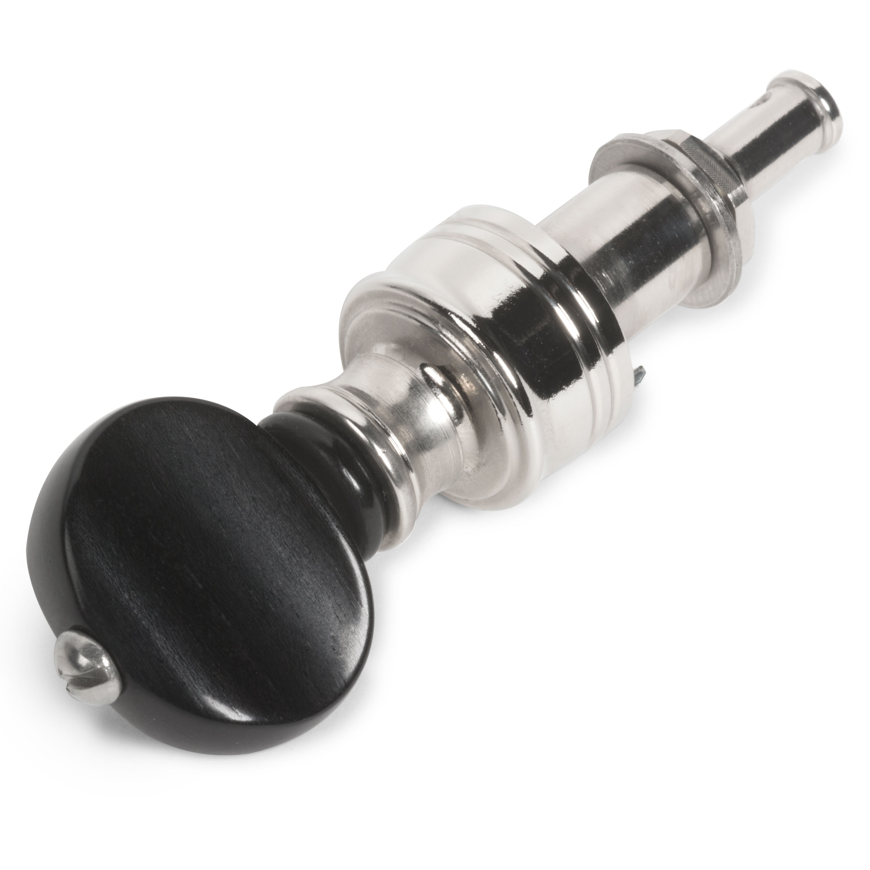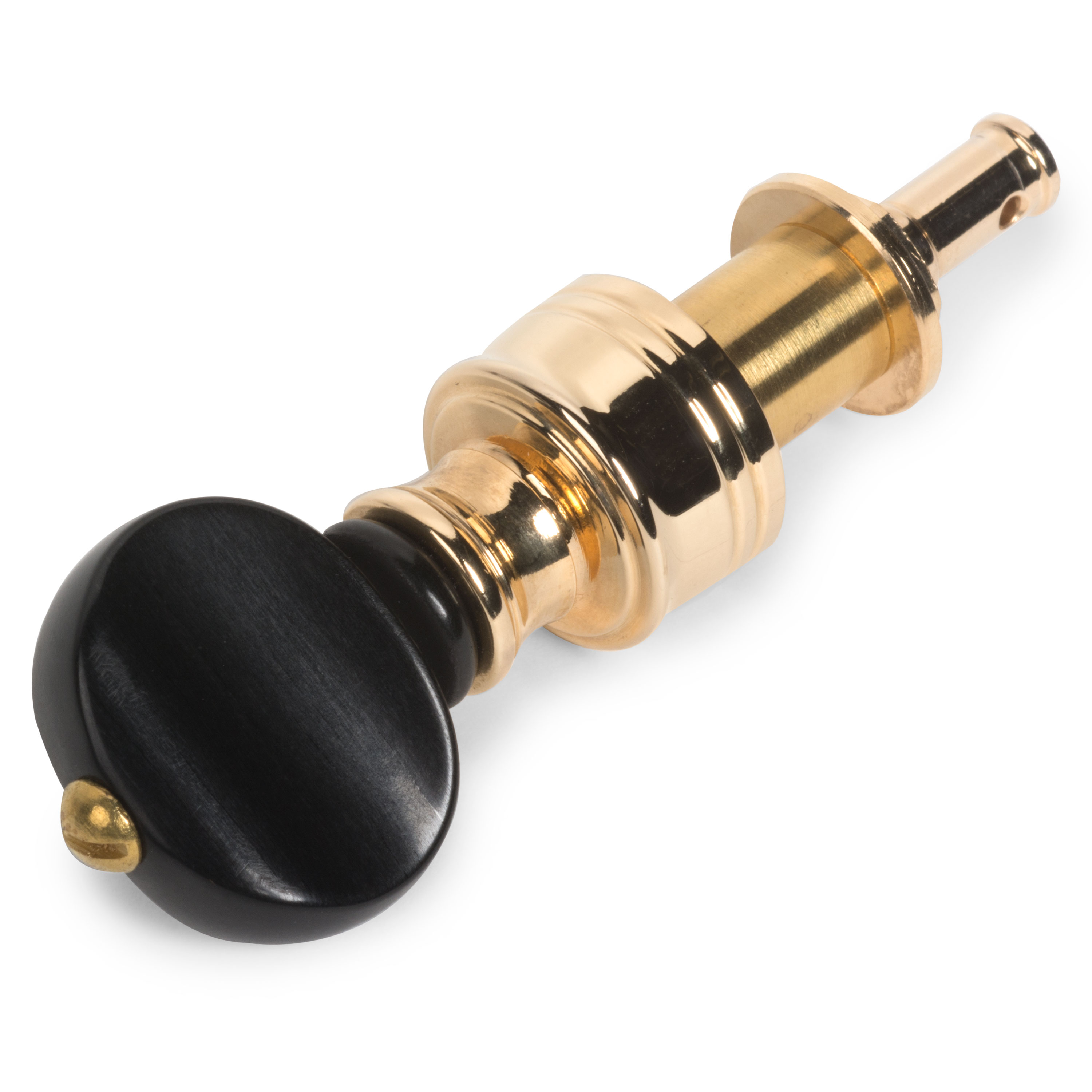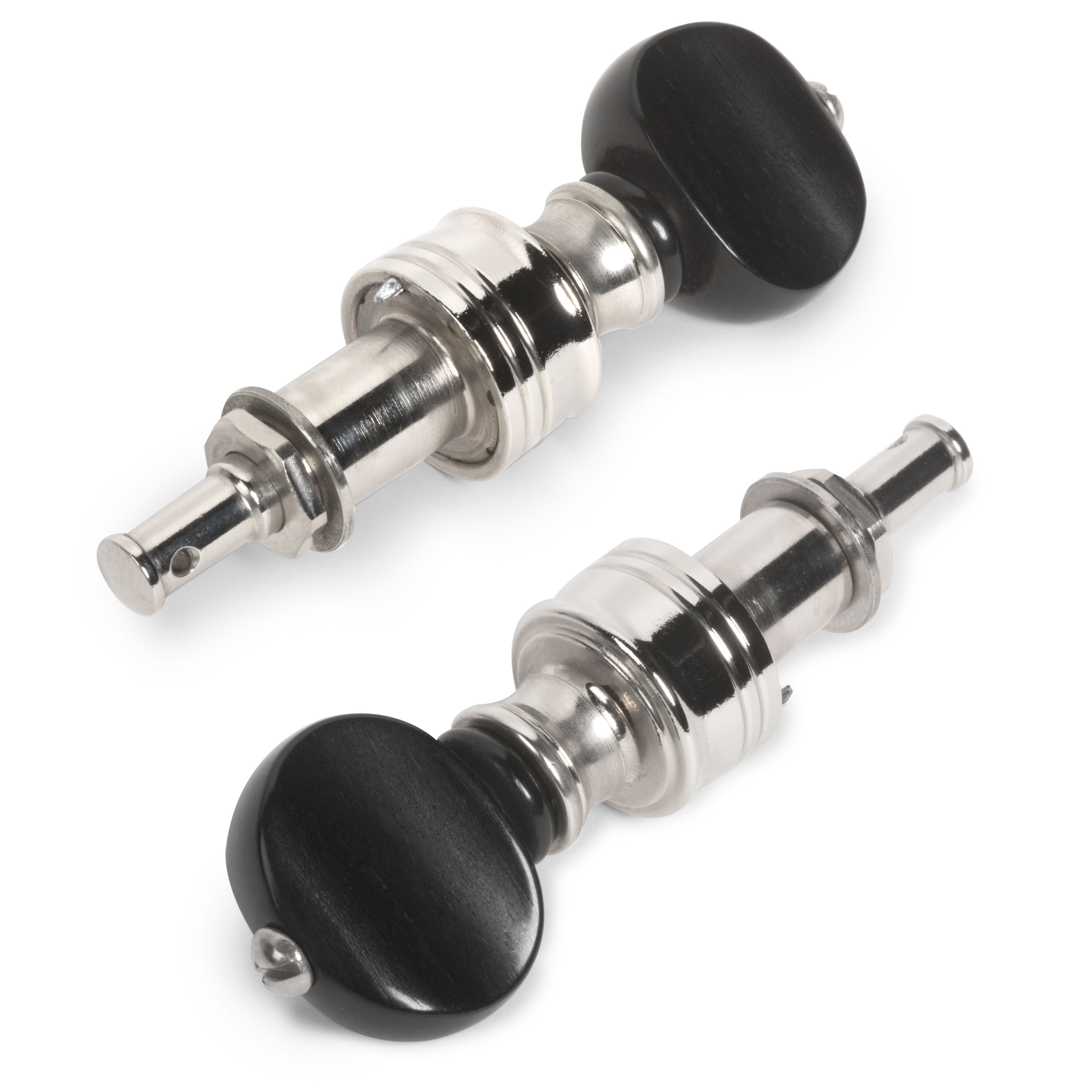 Estos revolucionarios clavijeros tienen una relación de transmisión mucho mayor (10:1) que esos viejos clavijeros, y absolutamente sin contragolpes. El engranaje siempre tiene tres puntos de contacto internos, básicamente bloqueando el poste en su lugar. Además, estos clavijeros no necesitan tornillos de tensión ni arandelas de cuero para evitar que la cuerda se deslice: el engranaje lo mantiene todo apretado.