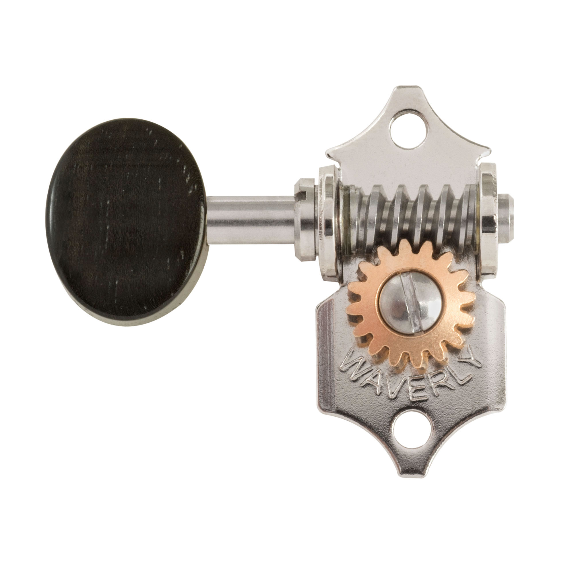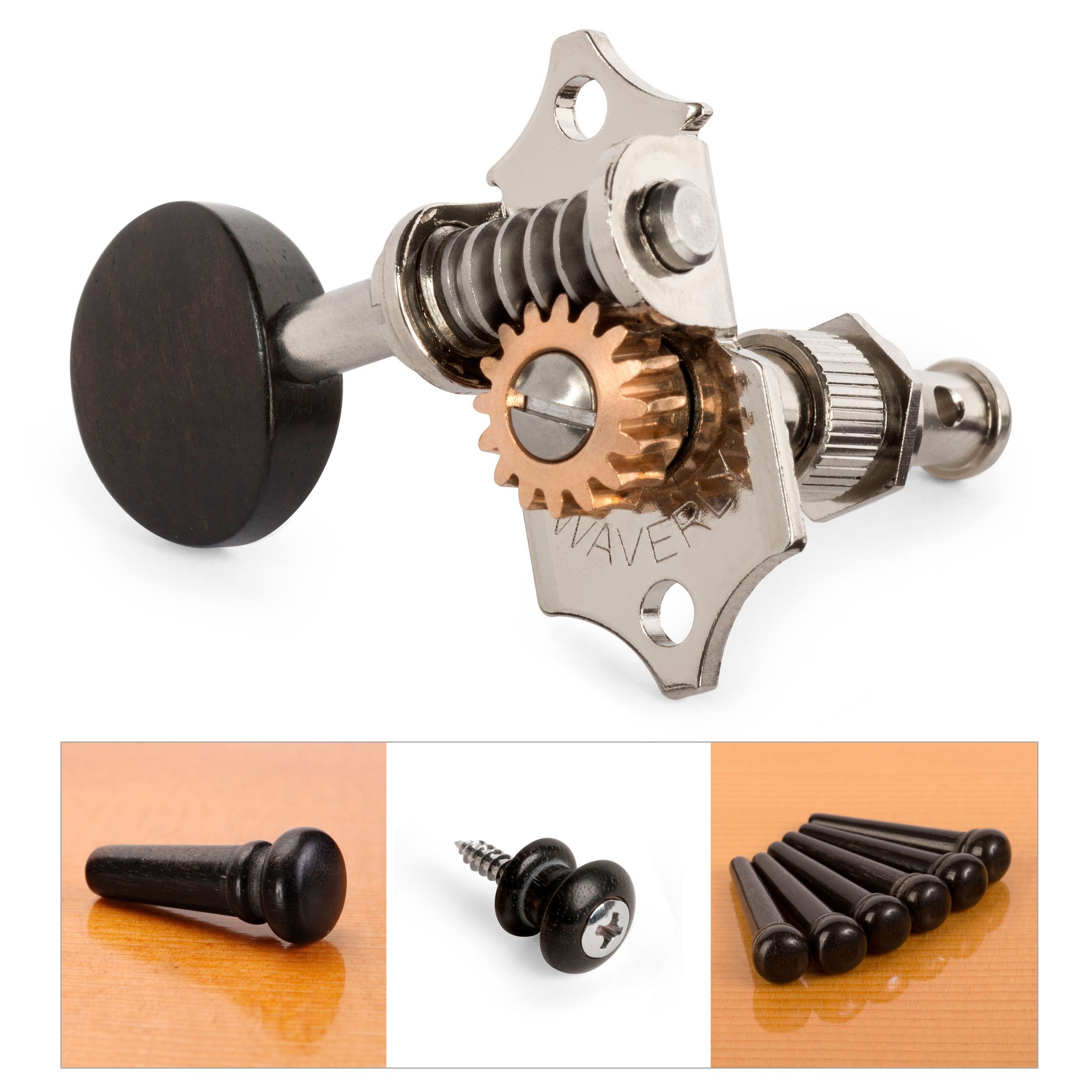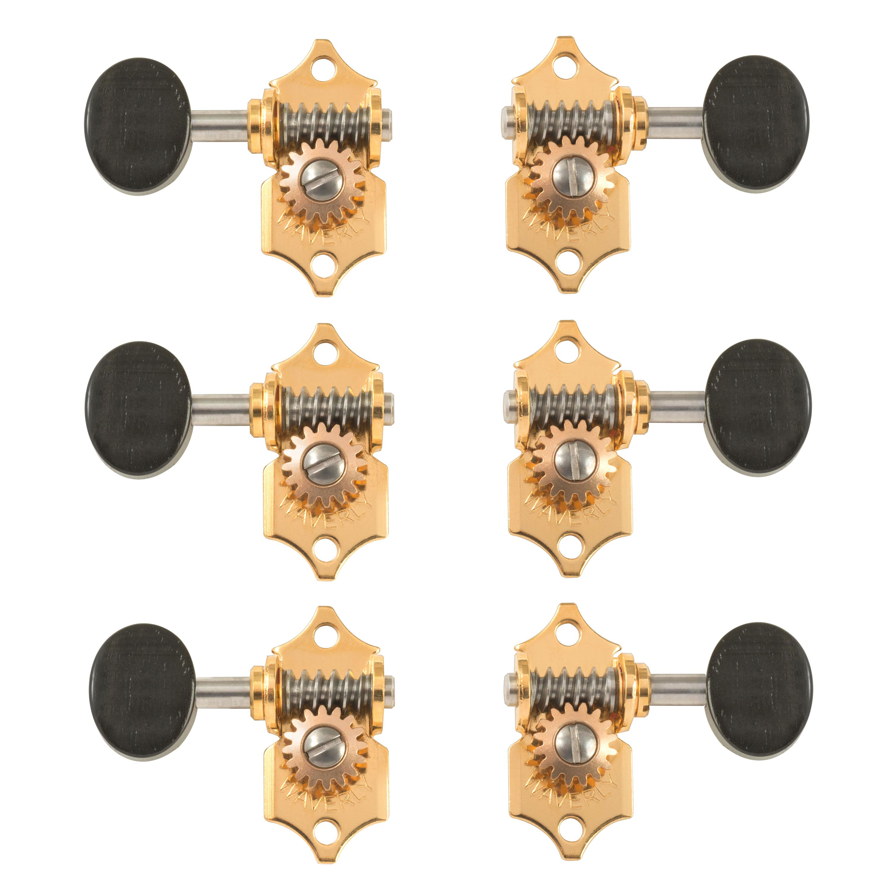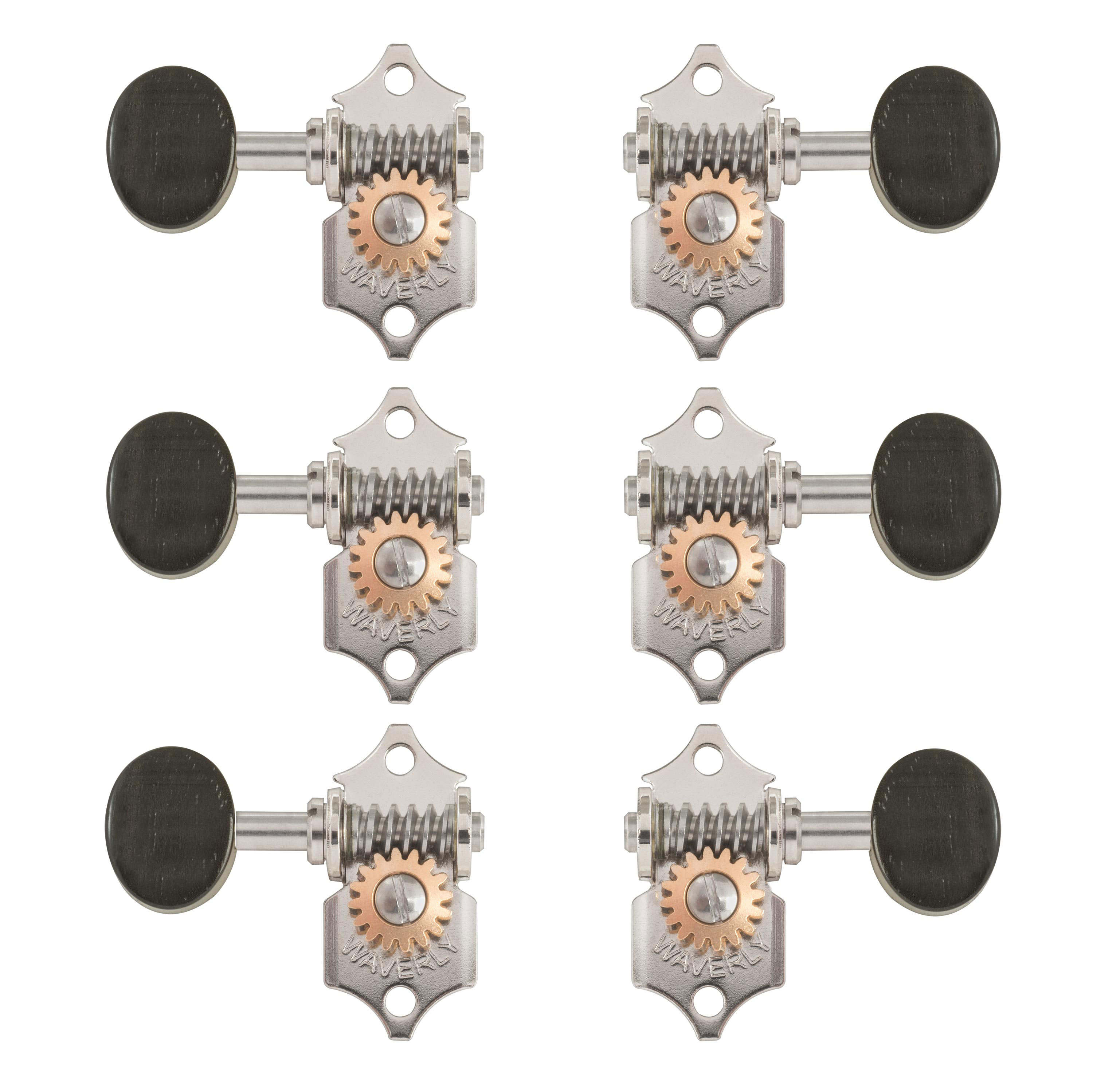 Tuning Machines: la elección de reconocidos guitarristas por sus mejores instrumentos. Waverlys cuenta con eje de cuerda cónicas de estilo antiguo y casquillos hexagonales de latón de ajuste a presión. Engranajes de tornillo sin fin de acero inoxidable con relación 16:1 de engranajes. Tornillos incluidos con este juego de 6 para cabezas de clavija 3+3 sólidas. También se vende por separado