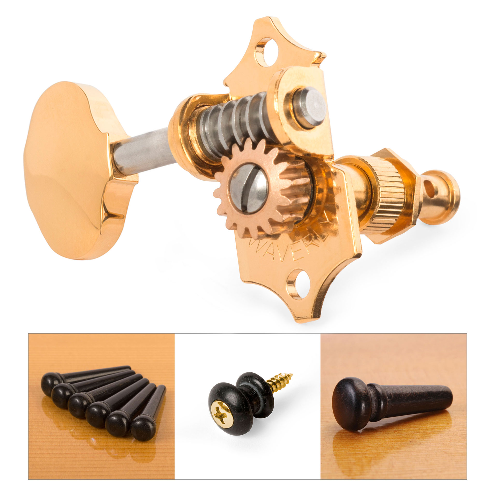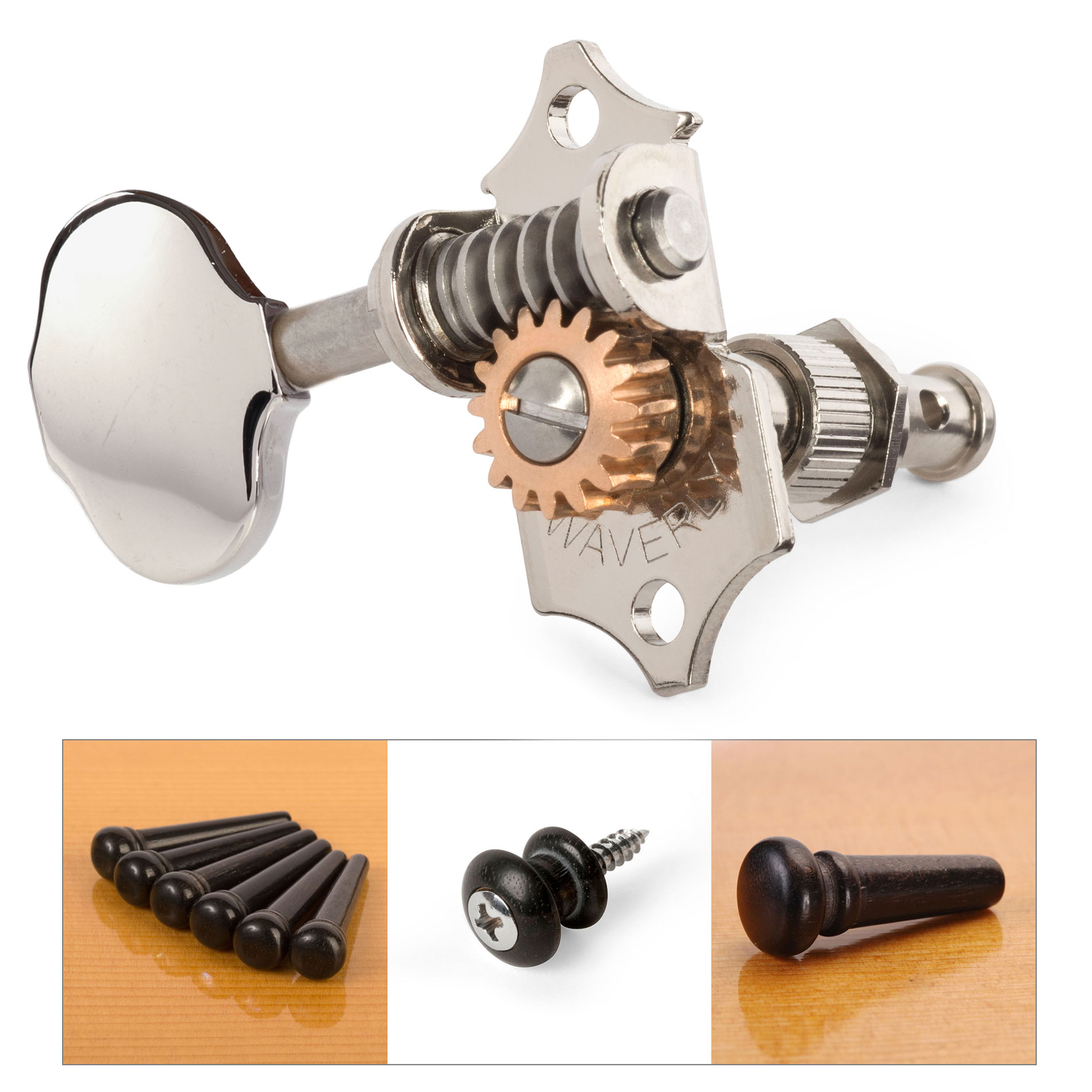 Tuning Machines: la elección de reconocidos guitarristas por sus mejores instrumentos. Waverlys cuenta con eje de cuerda cónicas de estilo antiguo y casquillos hexagonales de latón de ajuste a presión. Engranajes de tornillo sin fin de acero inoxidable con relación 16:1 de engranajes. Tornillos incluidos con este juego de 6 para cabezas de clavija 3+3 sólidas. También se vende por separado