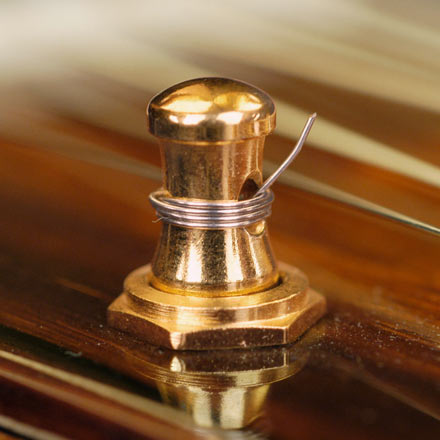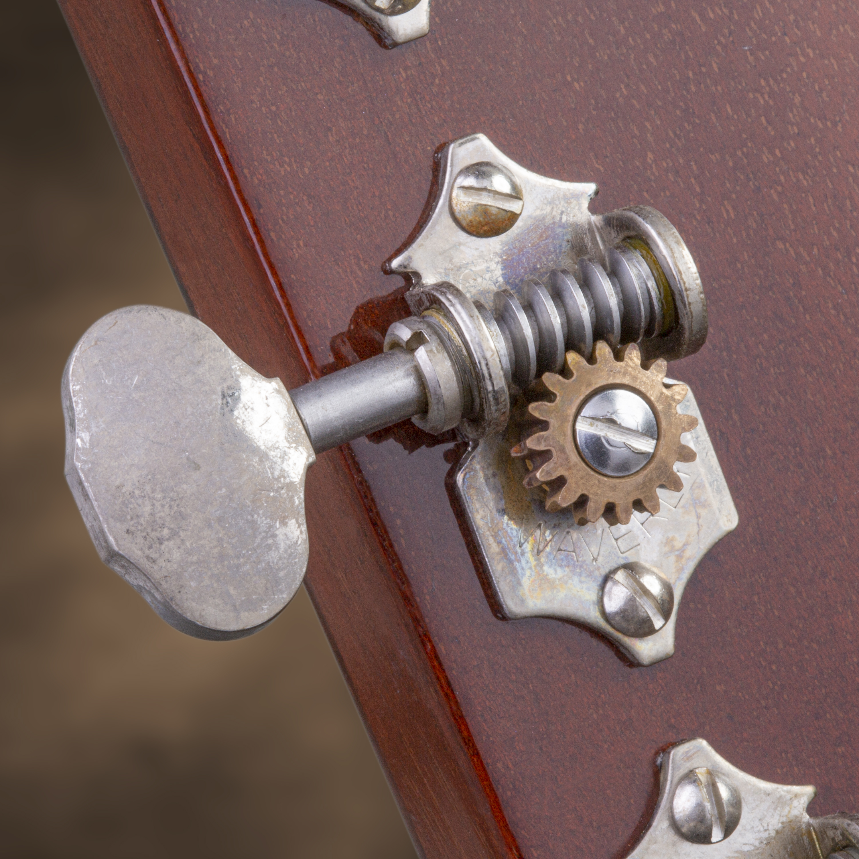 Las sólidas placas base de acero tienen la silueta auténtica de los años 30. Los ejes de cuerda son de latón con forma cónica tipo vintage, de 1/4" de diámetro, con casquillos hexagonales de latón estriado a presión que encajan en agujeros del clavijero de 11/32" de diámetro. Los tornillos de cabeza ranurada completan el aspecto vintage; no es necesario perforar orificios adicionales en muchas guitarras Martin y Gibson antiguas.