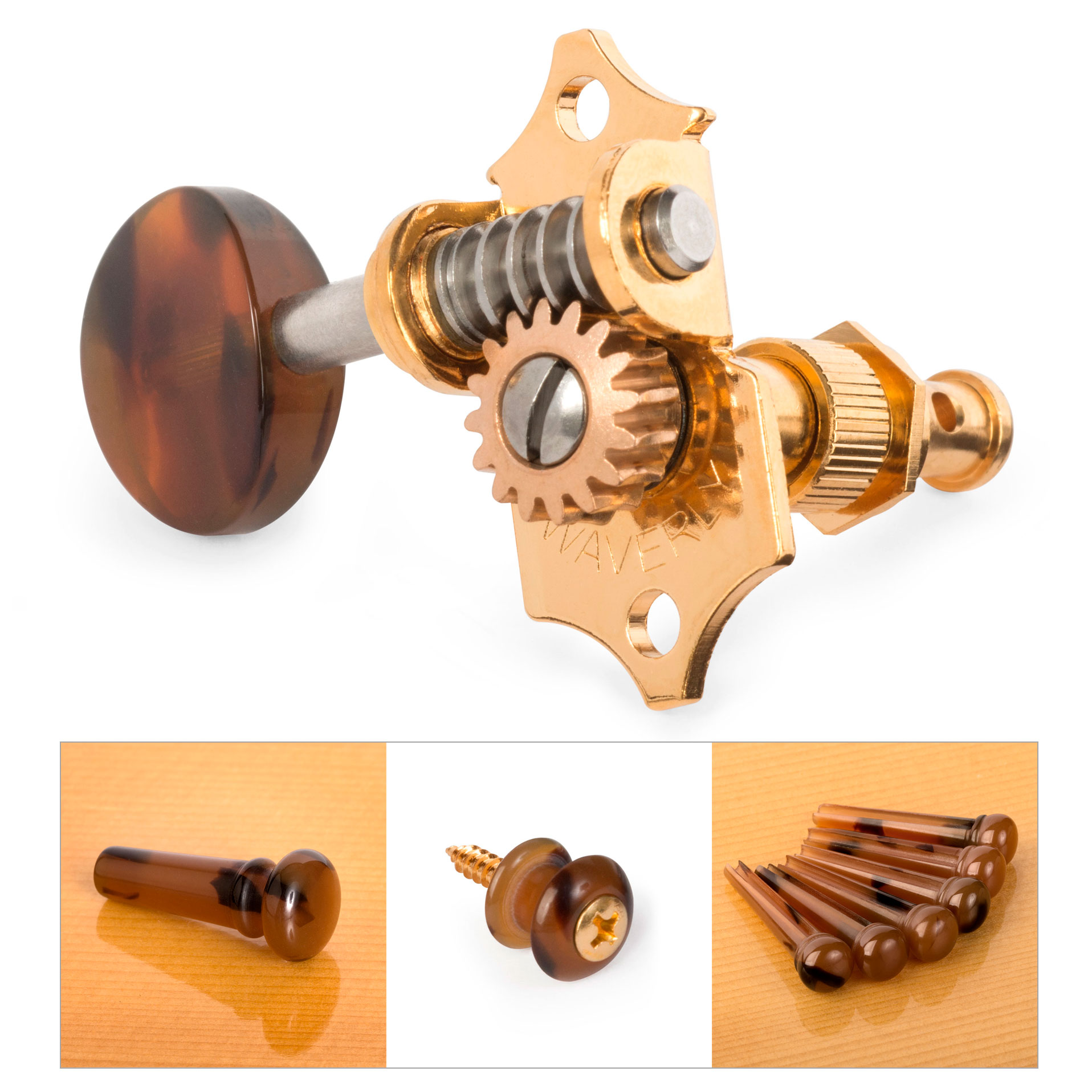 Estas máquinas Waverly están adornadas con nuestro material de carey oscuro especialmente mezclado, una extraordinaria simulación de carey natural. La luz pasa a través de ella y tiene un aspecto increíble como una tortuga carey protegida. ¡Una hermosa incorporación a una guitarra fina!Los clavijeros