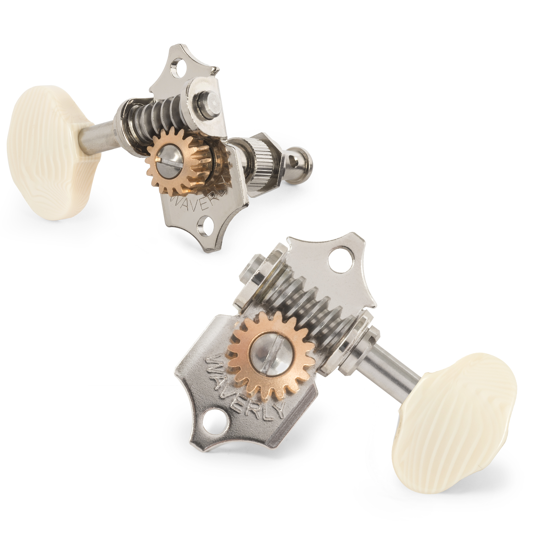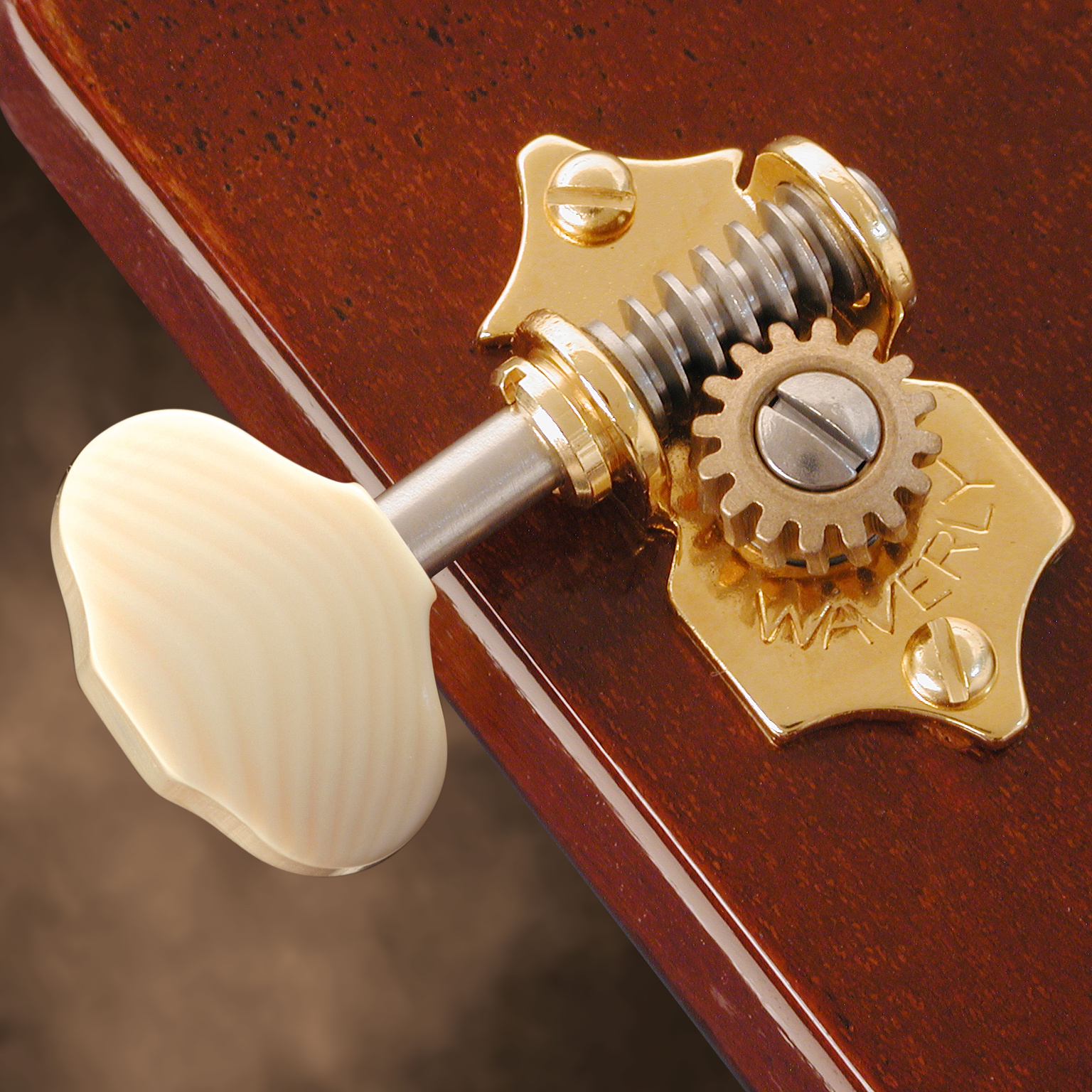 Con las clavijas Waverly, afinas tu guitarra y la afinación se mantiene. El diseño patentado de Waverly combina acero inoxidable con bronce para crear un ajuste suave y antideslizante. Las máquinas Waverly, clavijeros para instrumentos valiosos, están hechas a mano para ajustarse con precisión sin perforar guitarras Martin y Gibson antiguas. Fabricantes como C.F. Martin, Gibson, Collings, Santa Cruz, Huss & Dalton, Sams y Bourgeois eligen Waverlys por sus mejores instrumentos.