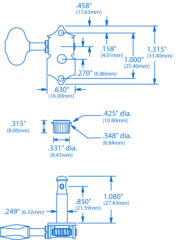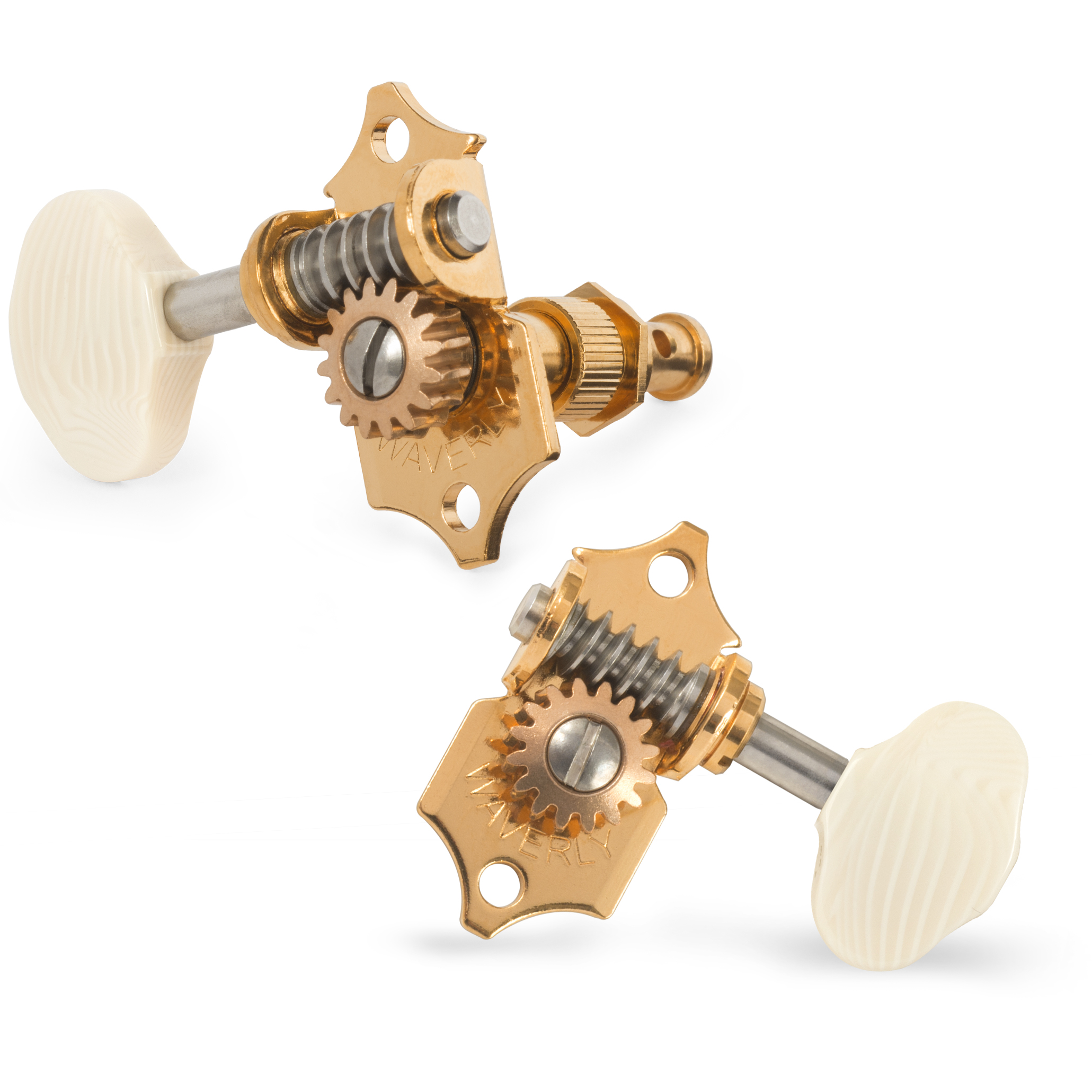 Los clavijeros Waverly cuentan con eje de cuerda cónicos de 1/4" de diámetro y los casquillos hexagonales de latón de ajuste a presión se ajustan a orificios de clavijero 11/32" de diámetro. Tornillos incluidos.