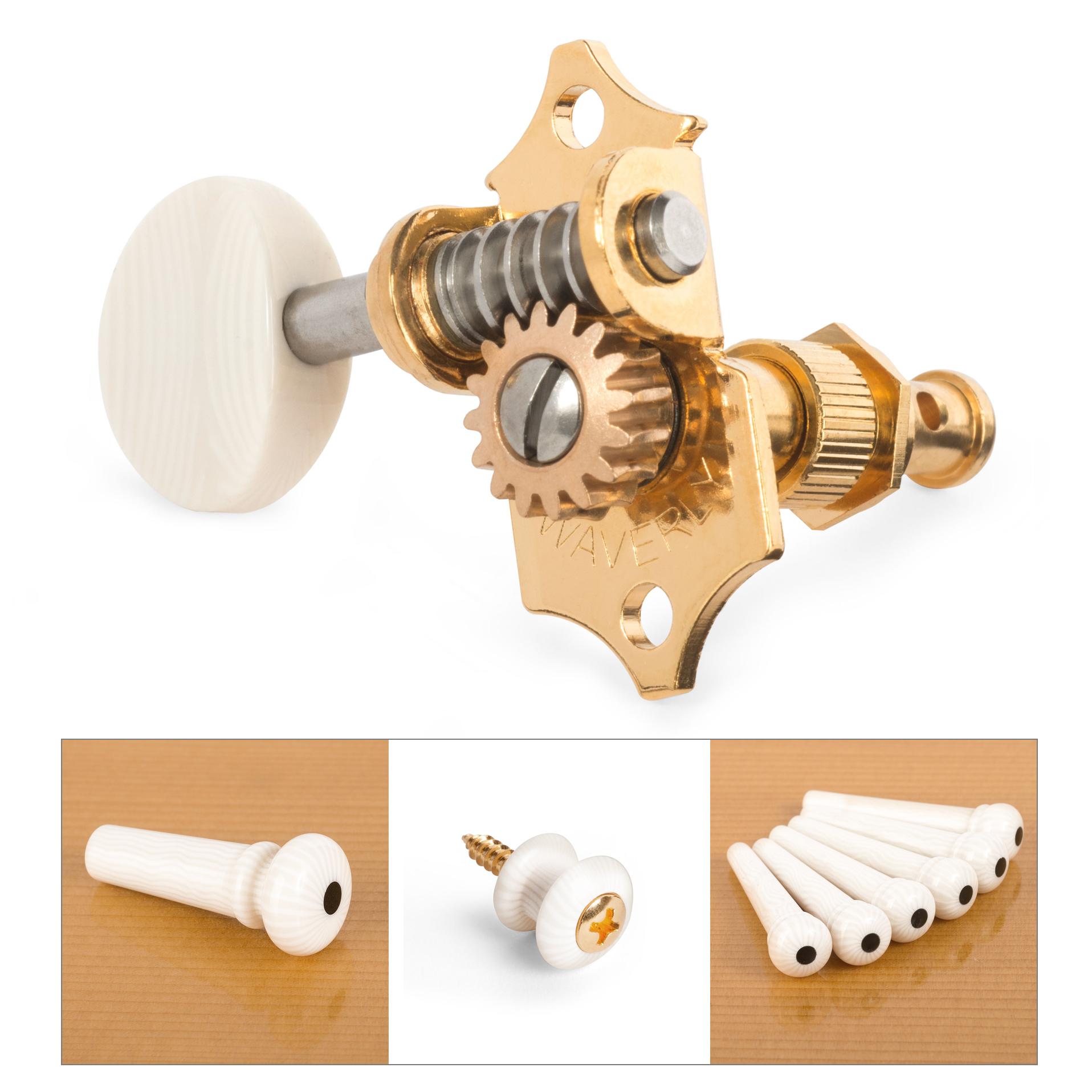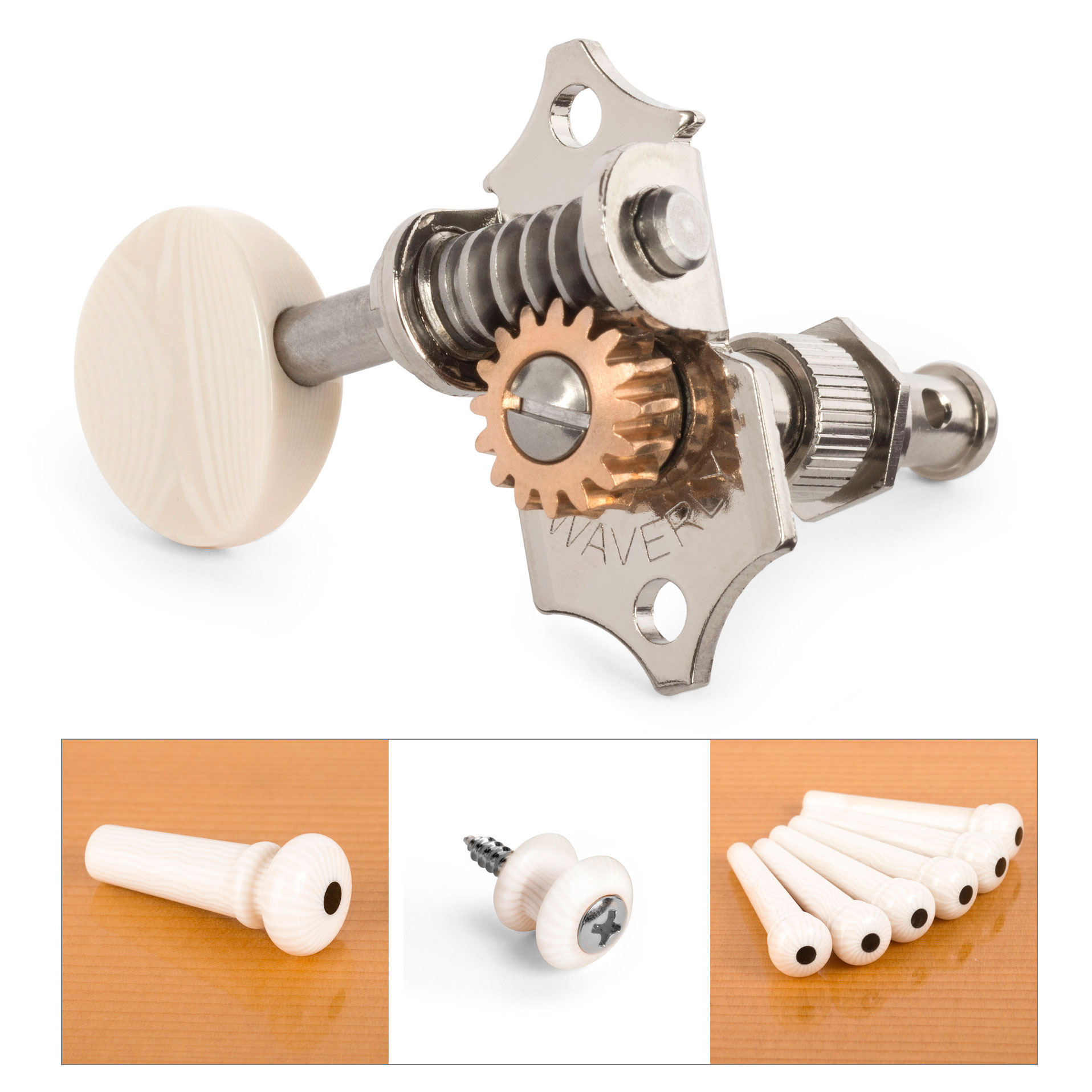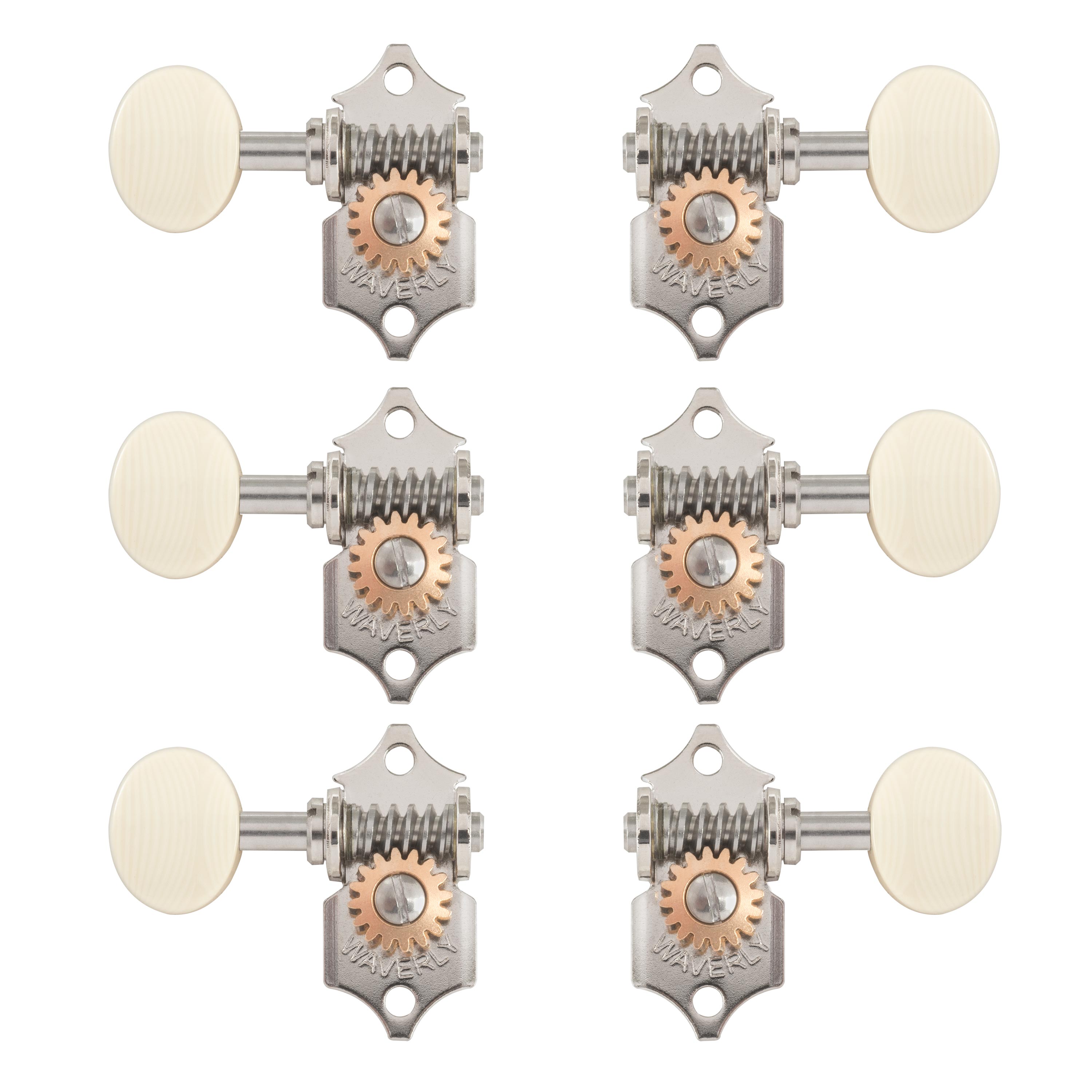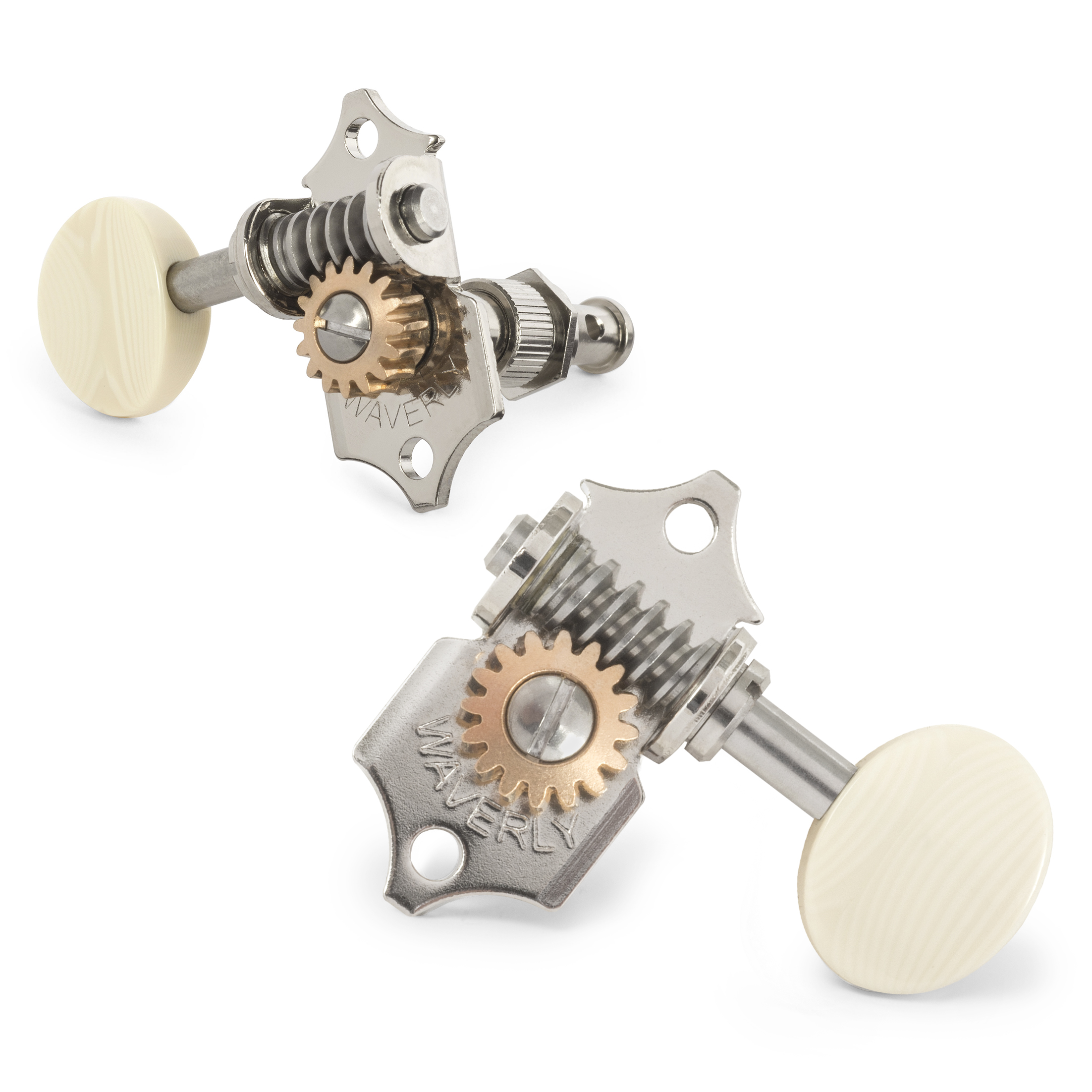 Los clavijeros Waverly cuentan con eje de cuerda cónicos de 1/4" de diámetro y los casquillos hexagonales de latón de ajuste a presión se ajustan a orificios de clavijero 11/32" de diámetro. Tornillos incluidos.