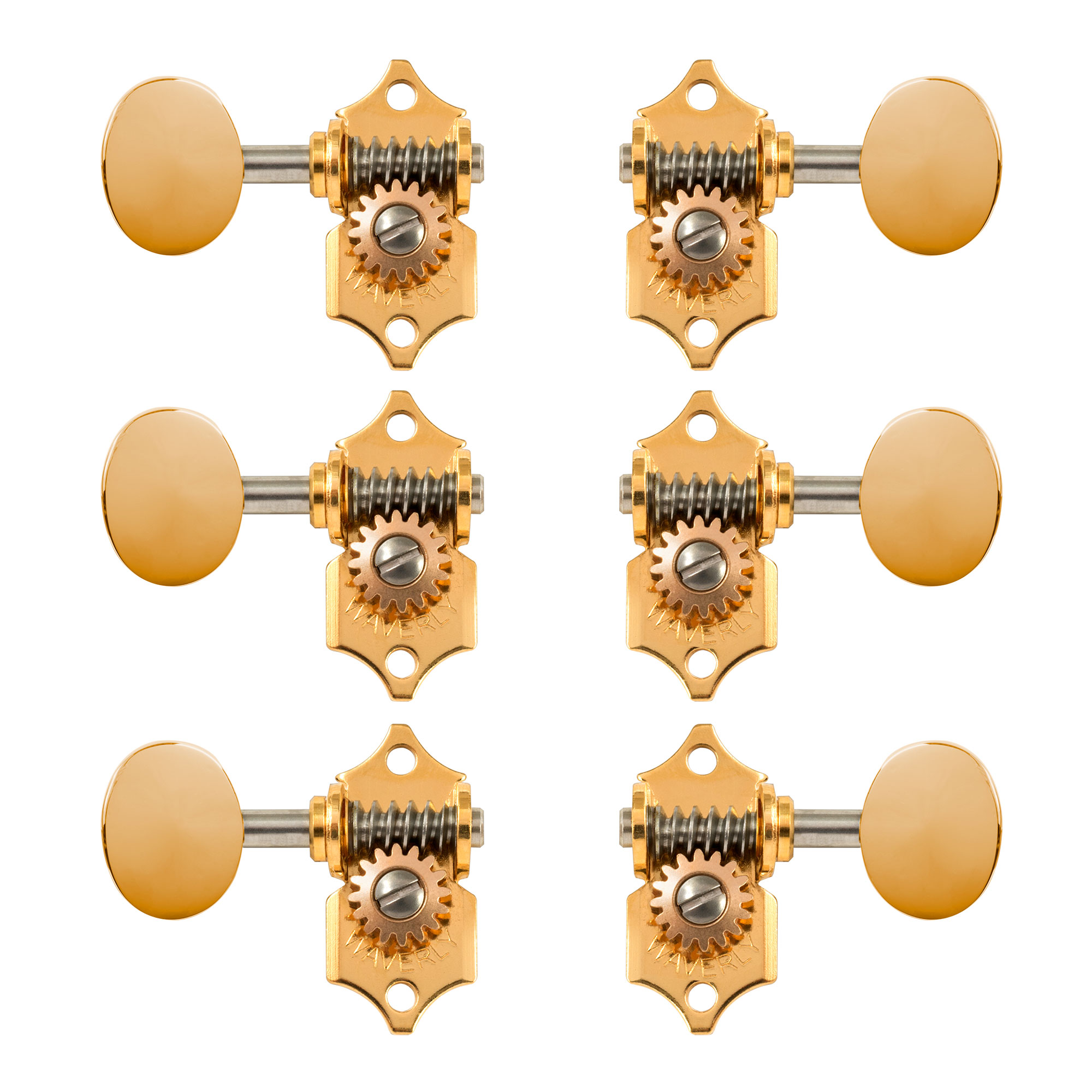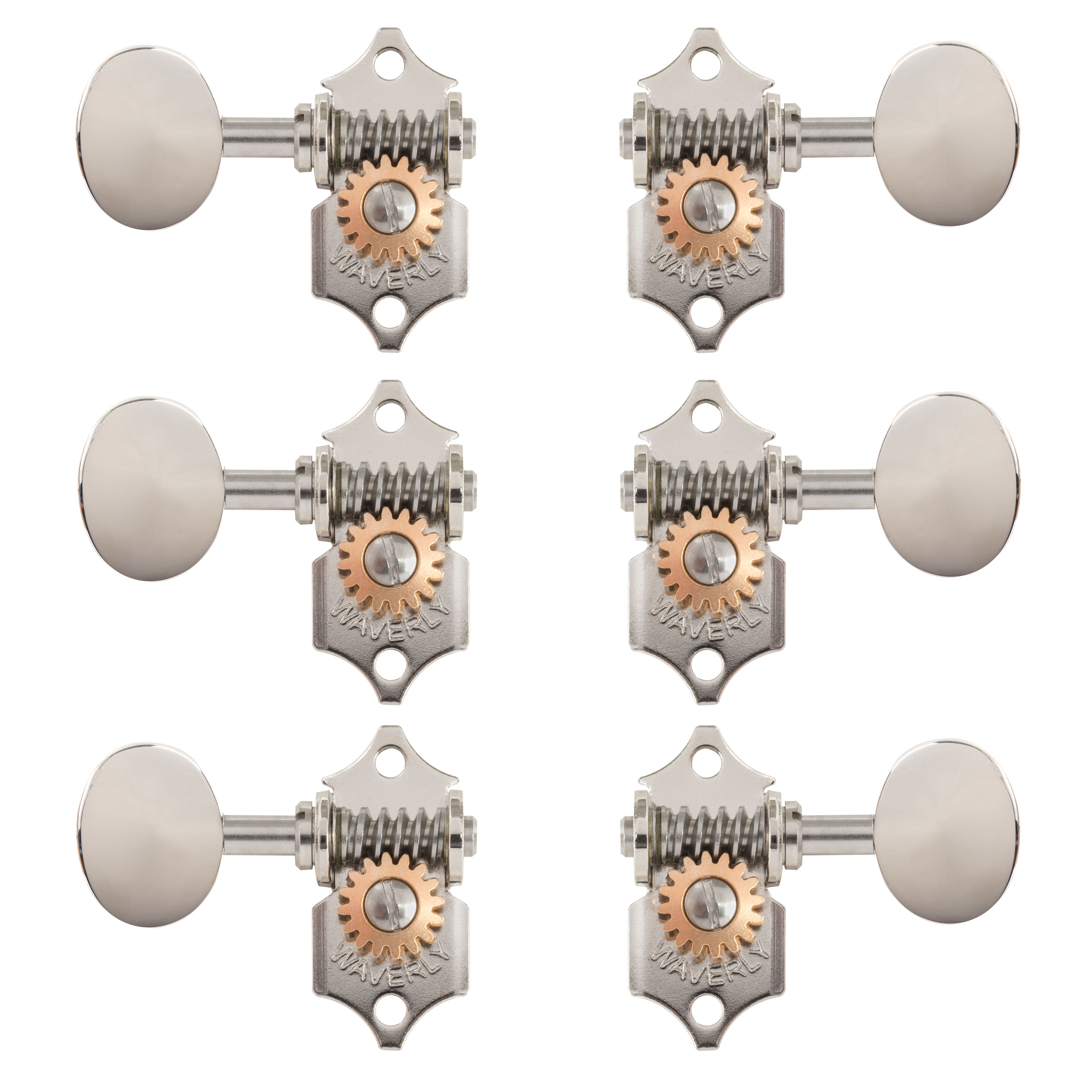 Tuning Machines: la elección de reconocidos guitarristas por sus mejores instrumentos. Waverlys cuenta con eje de cuerda cónicas de estilo antiguo y casquillos hexagonales de latón de ajuste a presión. Engranajes de tornillo sin fin de acero inoxidable con relación 16:1 de engranajes. Tornillos incluidos con este juego de 6 para cabezas de clavija 3+3 sólidas. También se vende por separado