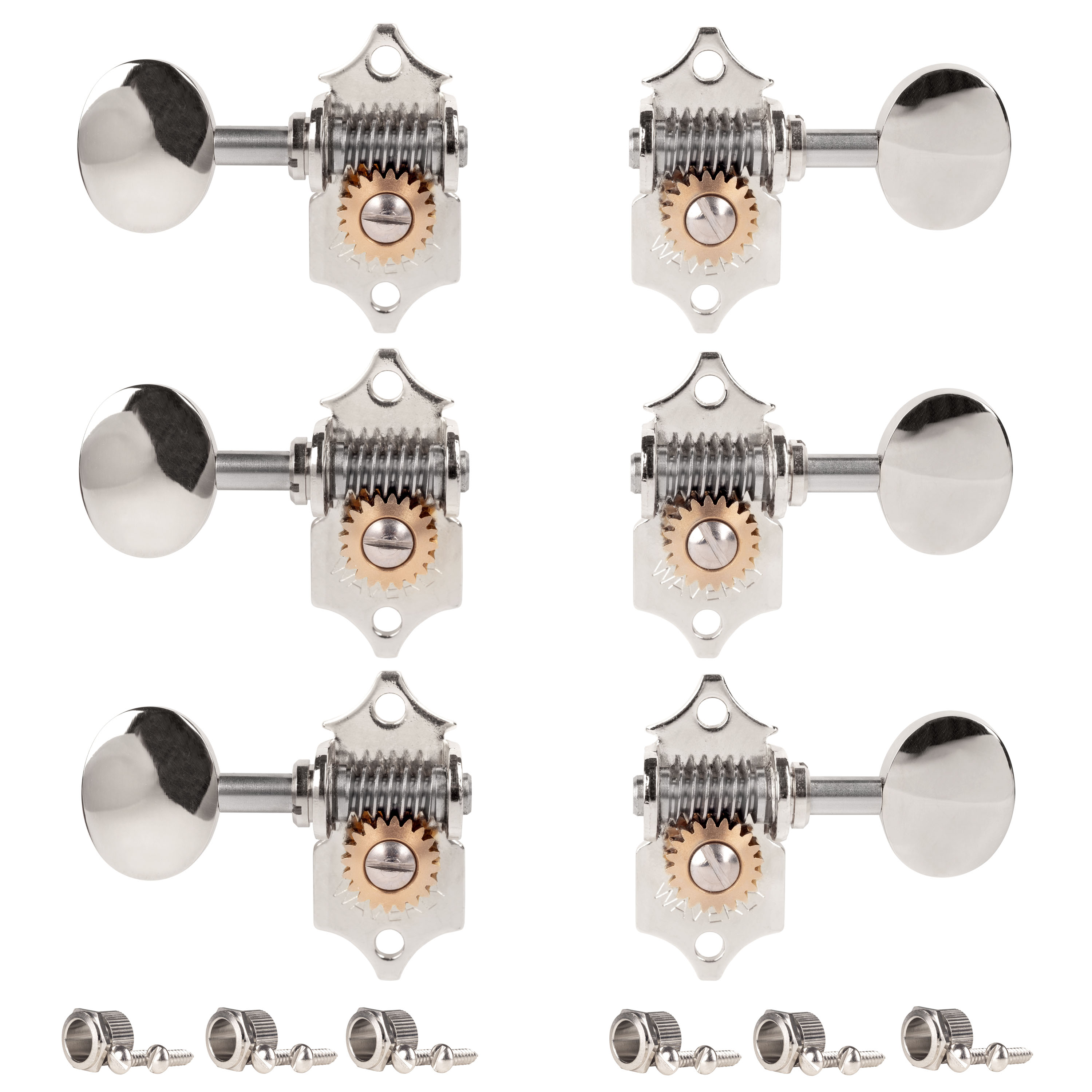 y lo mejor de todo, están diseñados para durar. Ensamblamos cada juego en nuestra tienda de Ohio y, si alguna vez fallan, están respaldados por nuestra Promesa de por vida. Ningún otro clavijero viene con esta fiabilidad. Este diseño atemporal, su construcción sólida y su funcionamiento suave y fiable han convertido a los clavijeros Waverly en los favoritos tanto de músicos como de reconocidos guitarristas durante más de 100 años.