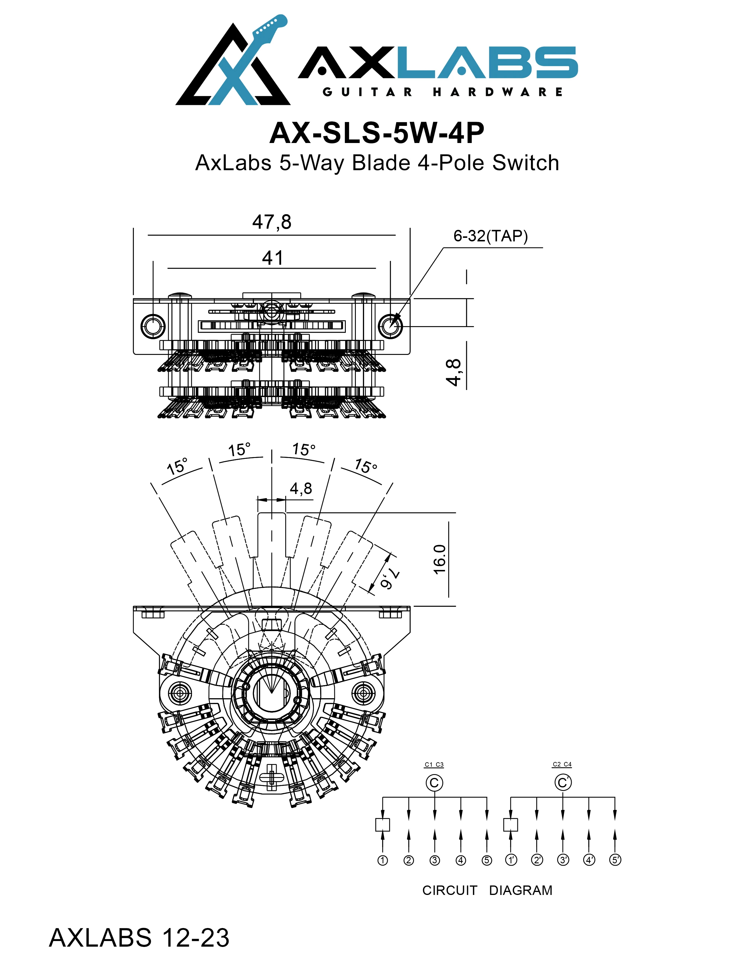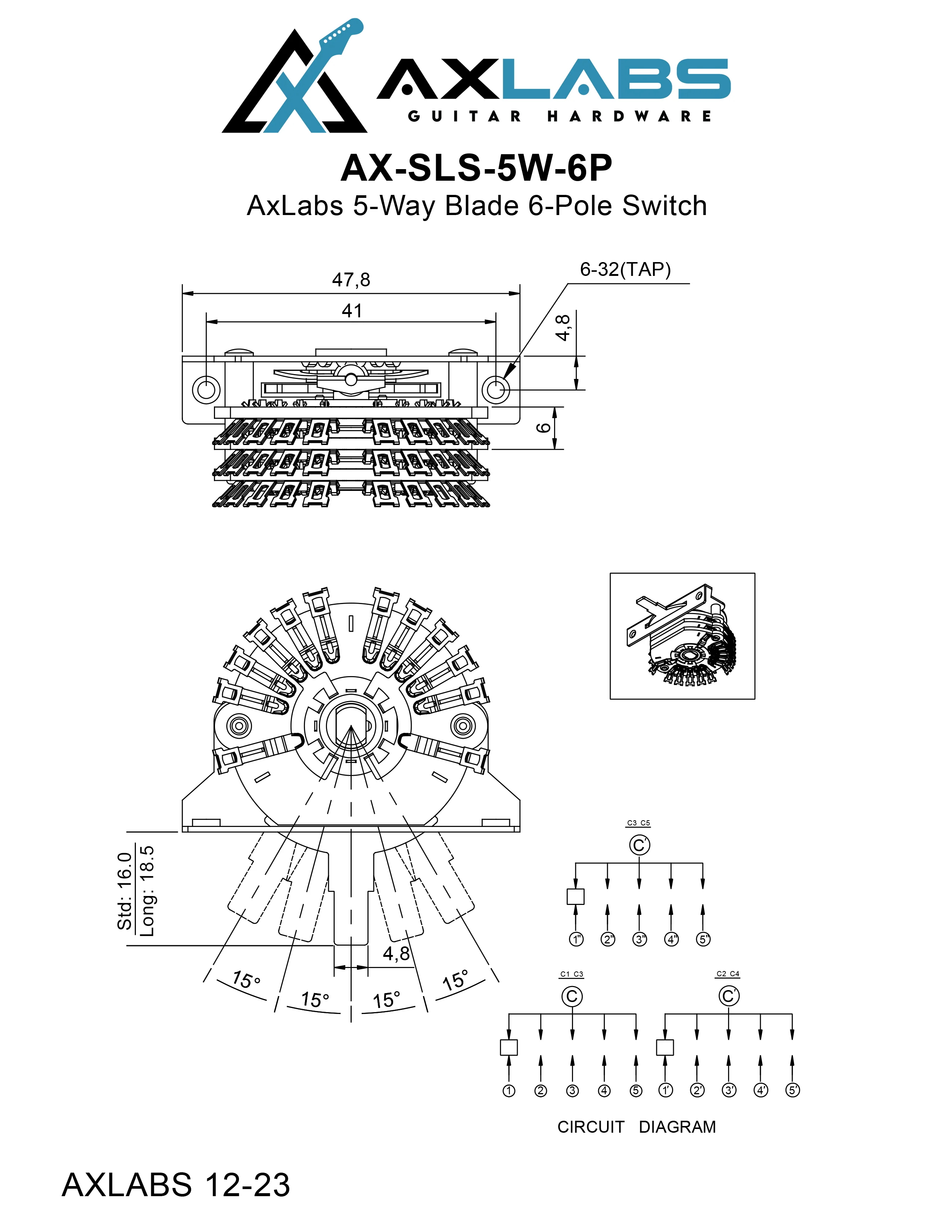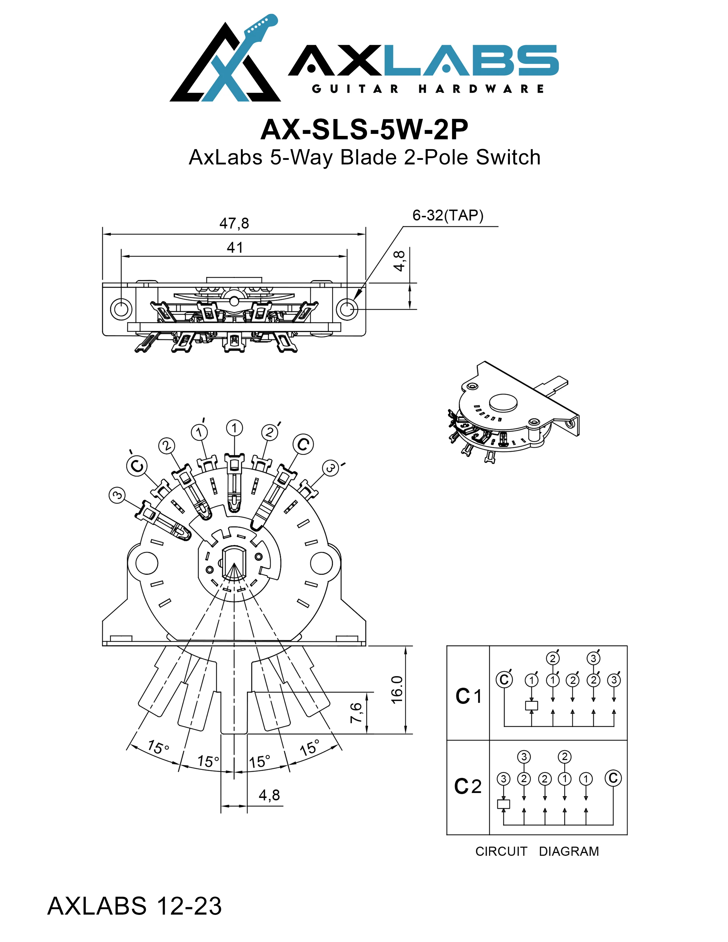selector selector clásico de alta calidad para guitarras con dos camionetas, como una Stratocaster, que permite diferentes combinaciones tonales. Los componentes de la guitarra AxLabs han ofrecido una sensación de calidad, sonido y fiabilidad durante más de cuarenta años. Ideal para sustituciones de especificaciones vintage, así como nuevas construcciones. Incluye perilla de selector negra. Una variedad de opciones de perilla se venden por separado.