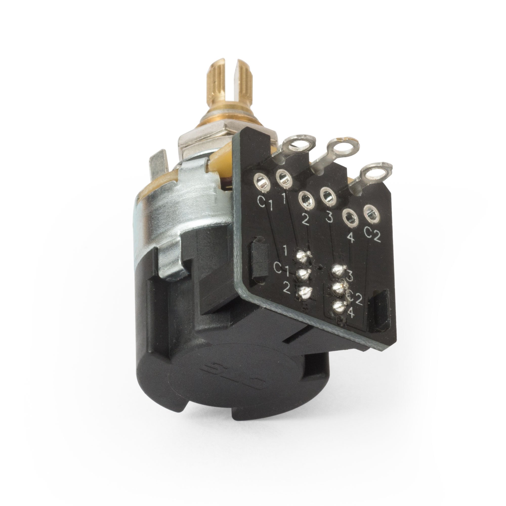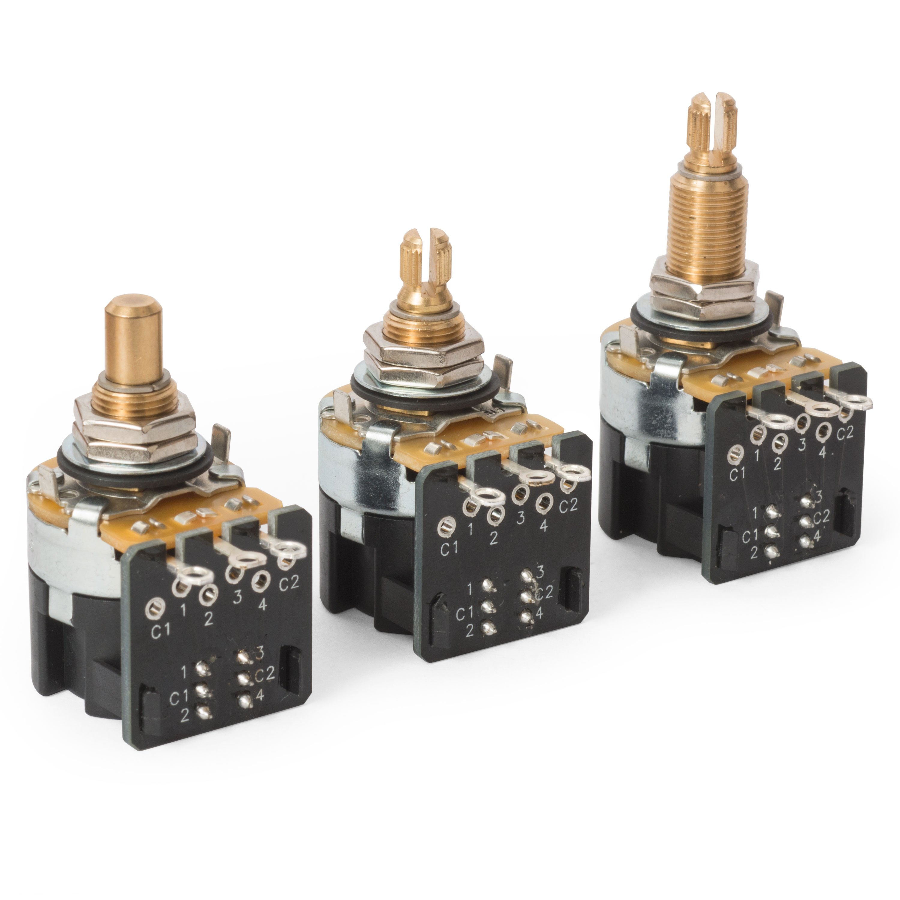 Los potenciómetros CTS han sido desde hace mucho la primera opción para las guitarras fabricadas en EE. UU. CTS trabajó con StewMac para crear este potenciómetros de control único. Además de ahorrar espacio, cuentan con un eje de latón de mayor duración y una tolerancia de resistencia del ±10 % más ajustada en comparación con los productos CTS que se ofrecen en otros lugares.
