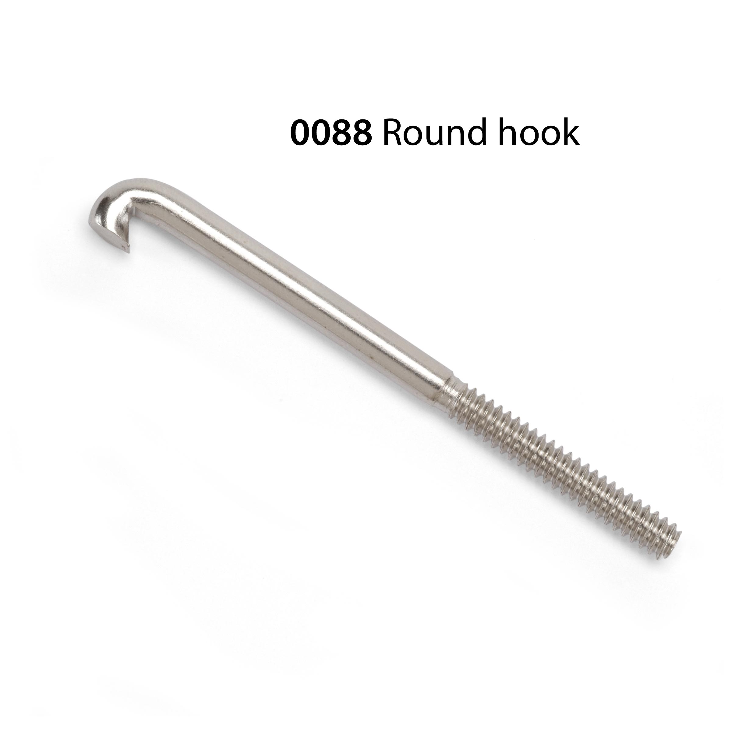 Nuestros ganchos de soporte tienen 2-1/2" (63,50 mm) de largo. La porción roscada 8 a 26 tiene 1" (25,40 mm) de largo. Los ganchos redondos tienen un diámetro de 4,01 mm (0,158"); los ganchos planos tienen un diámetro de 3,51 mm (0,138").