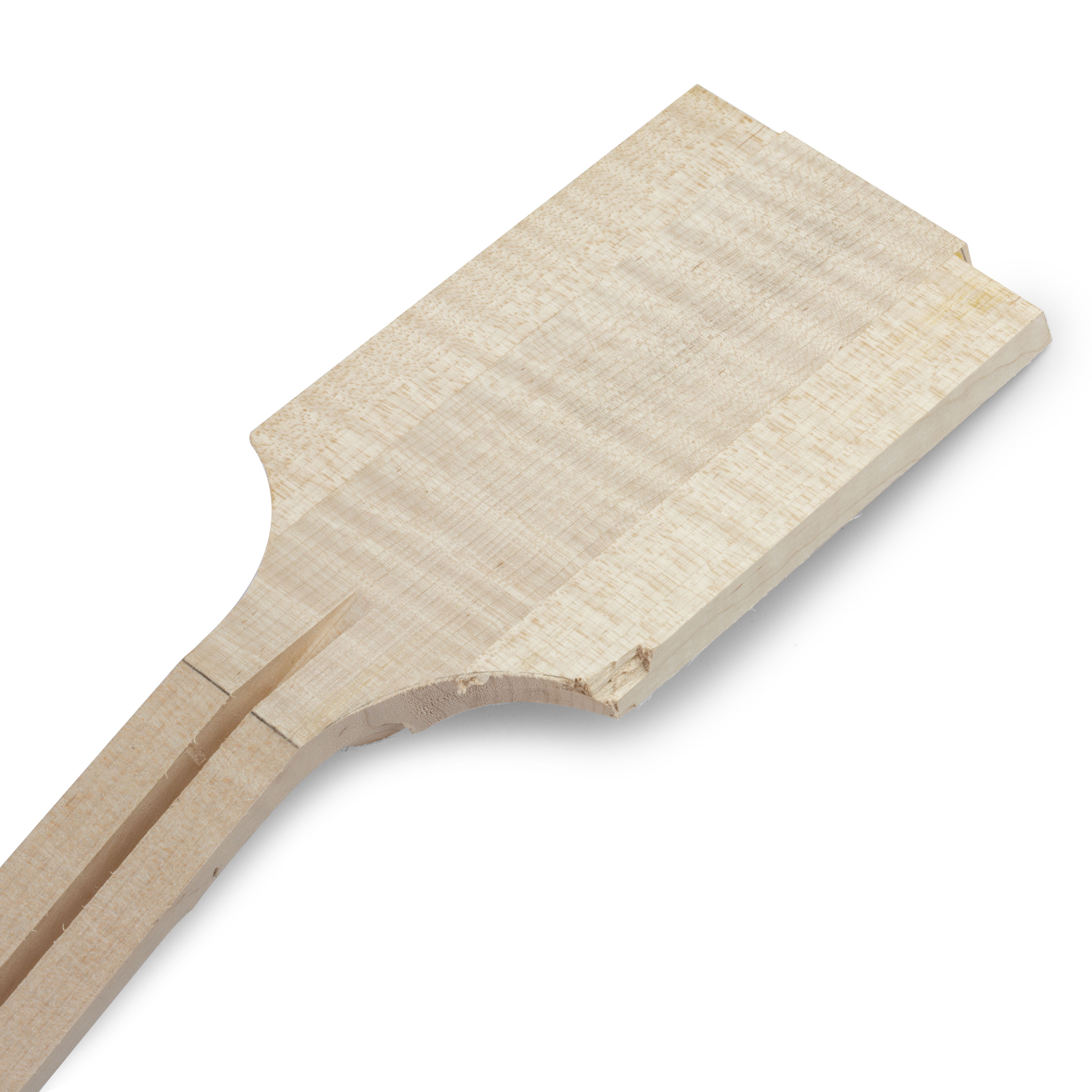 Hemos hecho el difícil trabajo de la máquina, para que pueda personalizarla como desee. Hecho de un hermoso arce rizado doméstico de grano de llama que termina maravillosamente, cuenta con una pala sin taladrar en blanco que puede cortar con una sierra de banda a cualquier forma antigua que desee. Listo para dar forma, lijar y terminar.