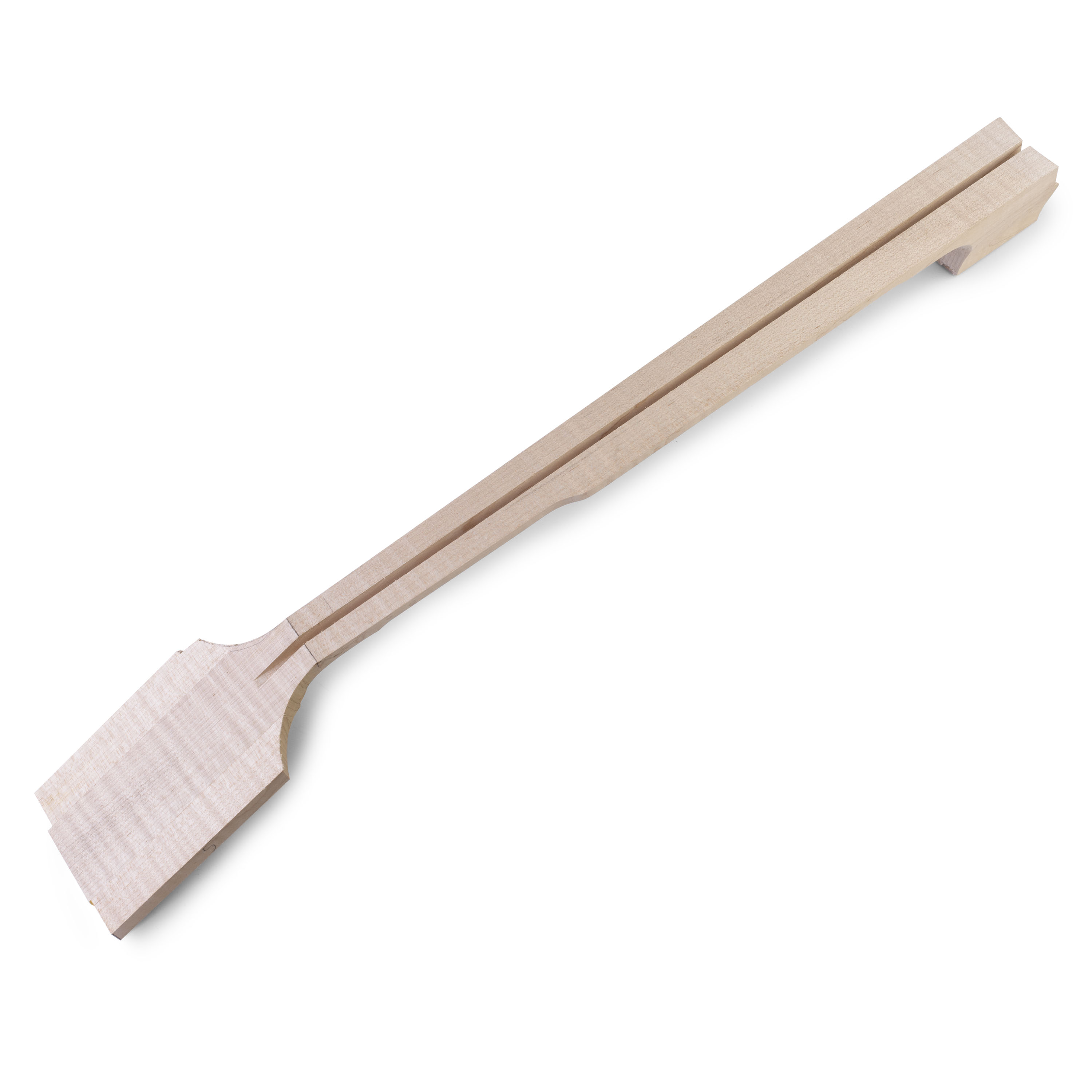 Este es un mástil de una pieza de alta calidad con orejas pala a emparejado . Ahorrará tiempo y no necesitará herramientas para trabajos complicados en la máquina: el perfil del talón y la parte superior de la mano de pala están moldeados y las superficies superiores están lijadas planas. La cabeza de clavija mide 95,25 mm x 177,80 mm ( 3-3/4 x 7). Se ha cortado una ranura de 5,56 mm x 11,11 mm ( 7/32 x 7/16 pulgadas) para que se ajuste a nuestra tuerca hexagonal Almas Hot Rod. El ancho de la tuerca es de 1-3/16" (30,16 mm). No se taladra el orificio para tetones de la 5.a cuerda, y no se incluyen la carilla del diapasón ni la del tetón.