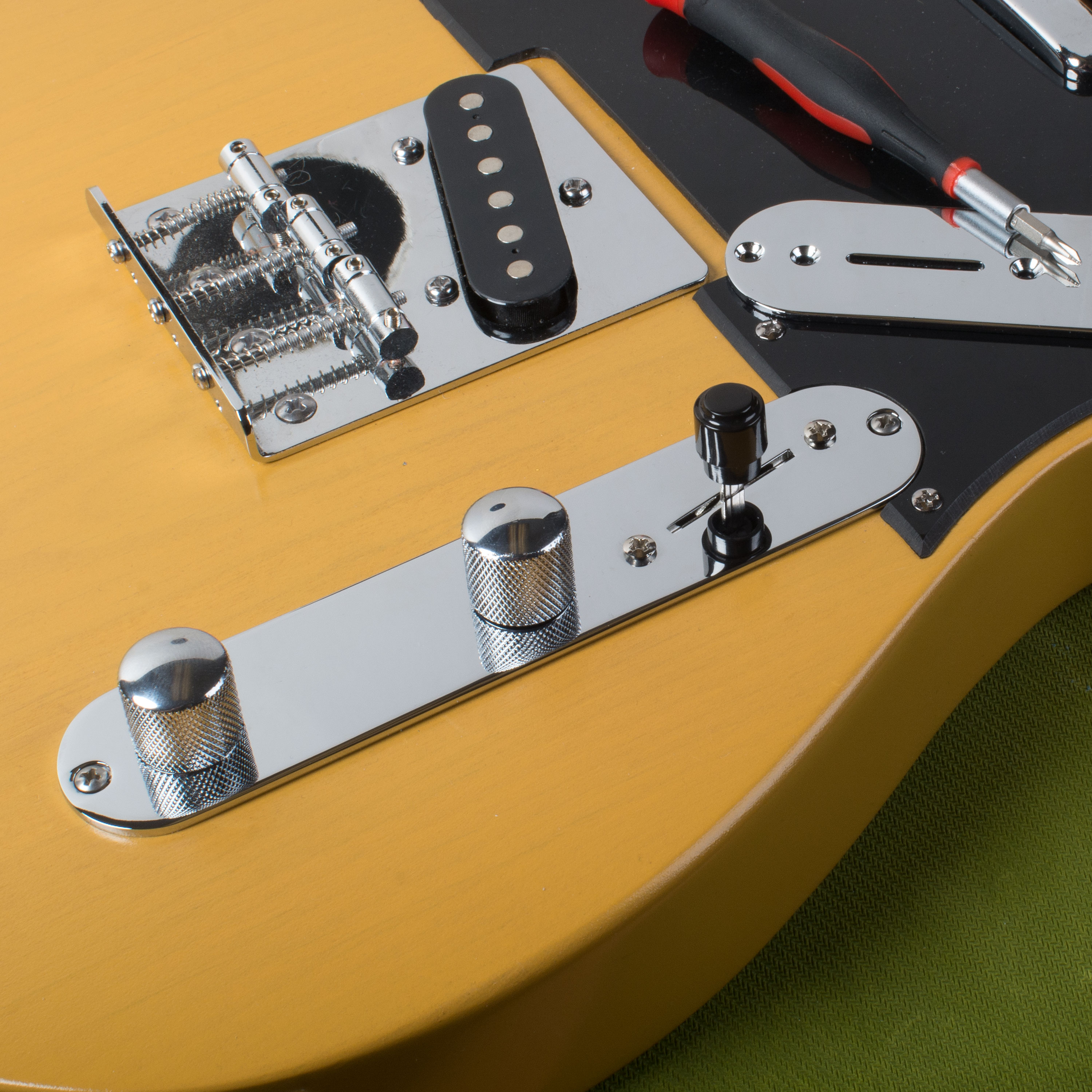 Los teledifusores® son guitarras increíbles, pero hay un defecto de diseño: la ubicación del selector. Con el selector en la posición del puente, es difícil cambiar las recogidas sobre la marcha, especialmente en el calor de un gig. Este simple ajuste resuelve este molesto problema para siempre.