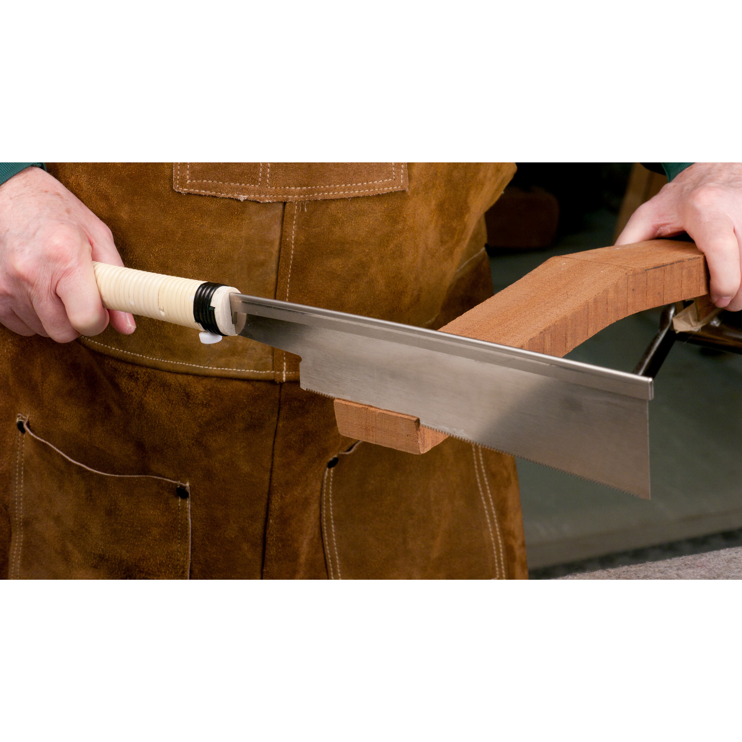 Al igual que otras sierras tradicionales japonesas para carpintería, la sierra de respaldo Dozuki es una herramienta finamente elaborada con dientes diseñados para cortar a presión (sierras occidentales cortadas en el recorrido de empuje). Con la práctica, descubrirás tres grandes ventajas del corte que se han ganado su lugar en tantos talleres de guitarra. En primer lugar, tirar de la sierra mantiene la hoja tensa, lo que permite una hoja más fina para cortes más precisos, vital para la carpintería, como tenones de cola de milano críticos. En segundo lugar, el corte por tracción hace posible un peso de sierra más ligero, por lo que la herramienta es menos cansada y más agradable de usar. Y en tercer lugar, ¡esta sierra corta rápidamente!La sierra Dozuki es un ejemplo de la artesanía y la eficiencia de las sierras tradicionales japonesas para carpintería. Cuenta con una hoja de acero de aleación de 0,011"-delgada de alta calidad con filo de corte de 9-1/2" (241,30 mm). Los dientes cortados con precisión están doblados a 0,015" para un corte transversal eficiente, y la columna de acero está ligeramente arqueada para una rigidez adicional. The blade depth tapers from 2-1/16" to 1-5/8" (52,39 mm to 41,28 mm)—ample for trimming braces, blocks, linings, peghead veneers, fingerboards, dovetail tenons, bridge blanks and more. El tradicional mango de bambú envuelto en ratán proporciona un cómodo agarre antideslizante.