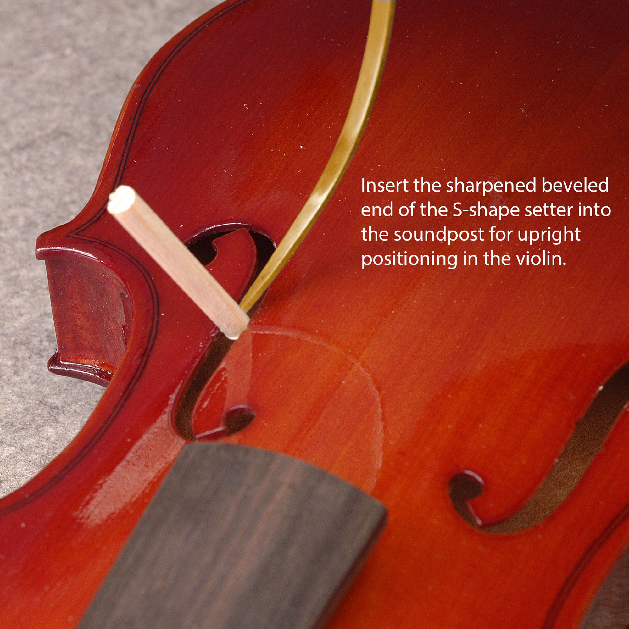 #0388 Setter en forma de S: Inserte el extremo biselado afilado en la tija de sonido para colocarlo en posición vertical en el violín. Utilice el extremo con muescas para ayudar a alinear el poste en la posición final.