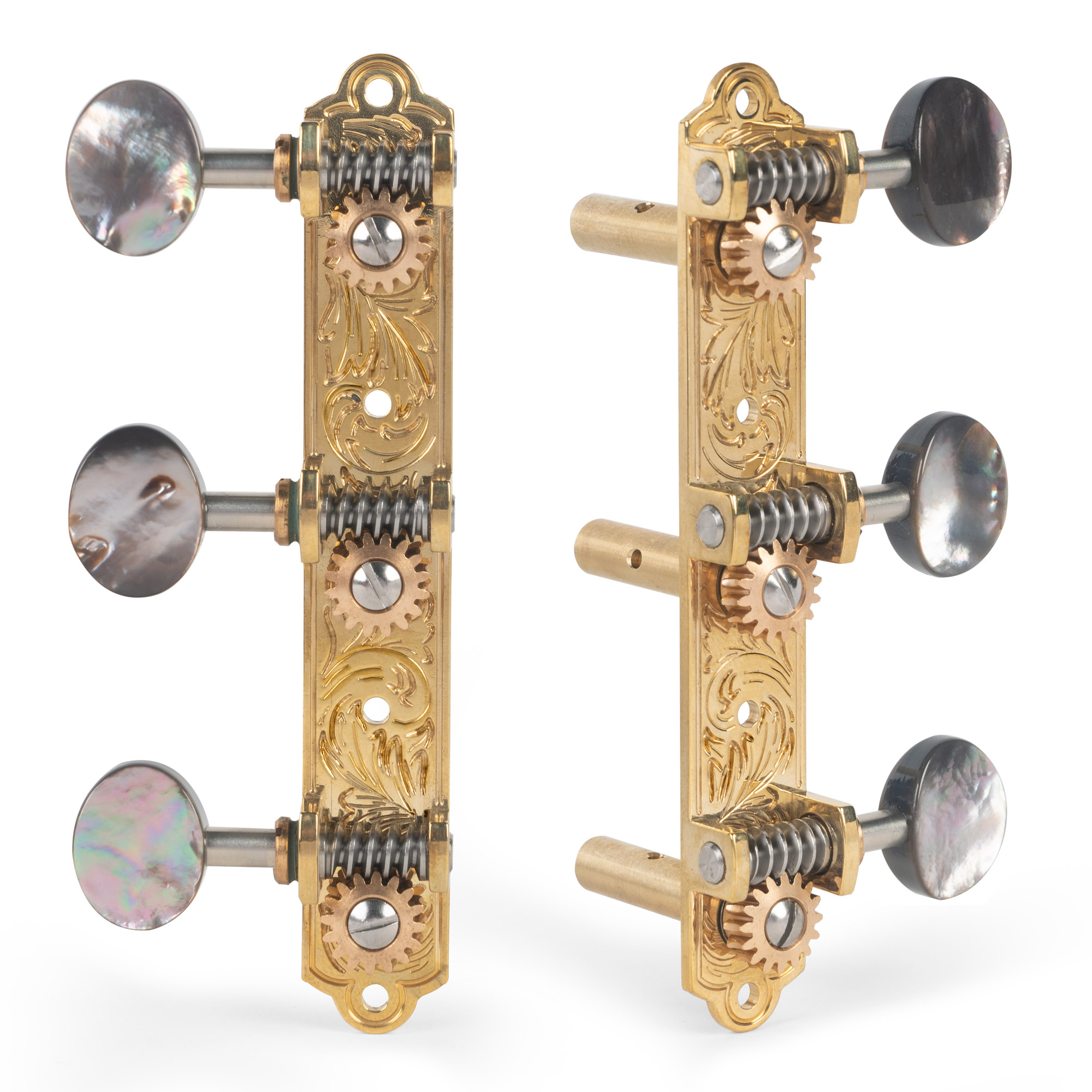 La madreperla auténtica le da a los Pearlknobs negros translúcidos un brillo que destaca de las imitaciones de plástico. El juego de sintonizadores incluye tornillos de montaje ranurada de cabeza redonda.