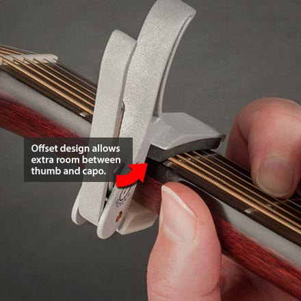 La primera cejilla offset del mundo. El innovador diseño offset de Grover le da a tu mano un poco más de espacio que un cejilla tradicional, un verdadero plus al formar ese complicado acorde B7 . Se enciende (y se apaga) rápidamente. Fabricado en aluminio ligero con acabado mate.