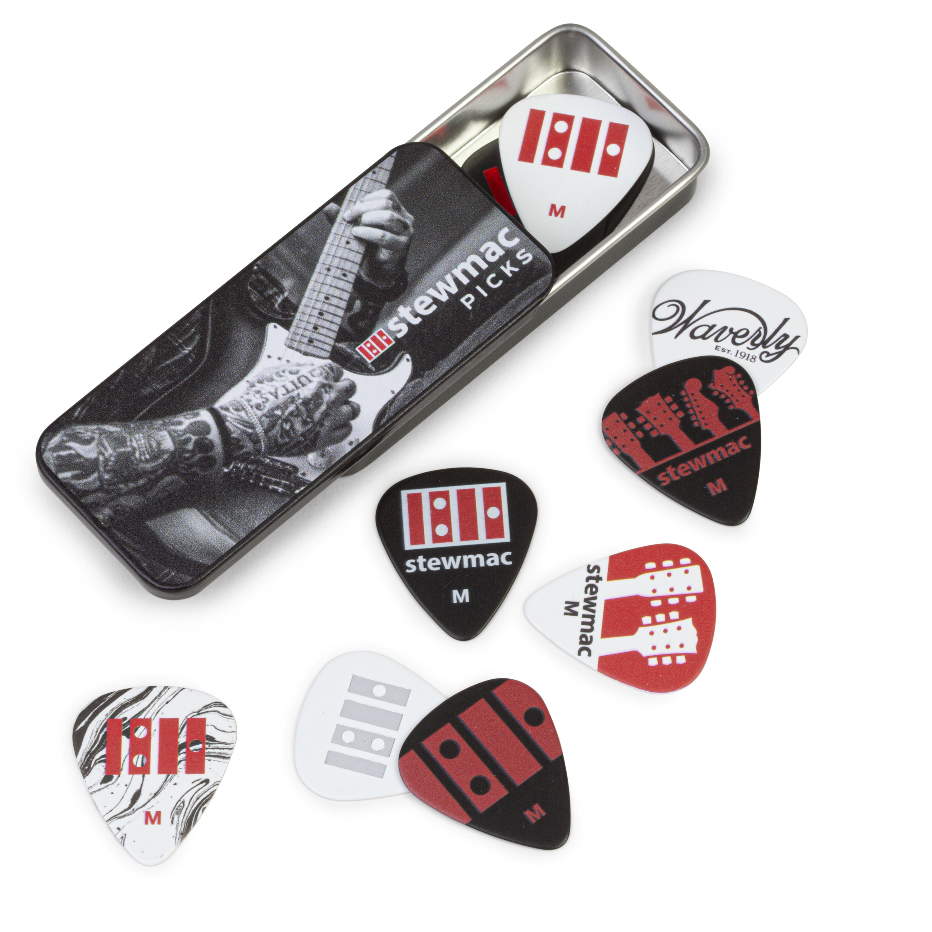 ¡Nunca más pierdas tus selecciones! Hecha a medida por Dunlop, esta lata de metal del tamaño talón del mástil mantiene tus artículos listos para el espectáculo. Cada lata incluye 10 púas celuloides medianas con diferentes diseños. El celuloide tiene un ataque rápido y un tono claro, uno de los favoritos de los jugadores durante décadas.