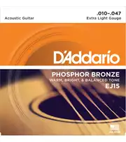 Las cuerdas Phosphor Bronze D'Addario están enrolladas con precisión con bronce fosforado resistente a la corrosión sobre un núcleo de acero de alto carbono cuidadosamente dibujado y con forma hexagonal. El resultado es un tono de sonido brillante y duradero con una excelente entonación.