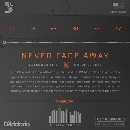 "Siga la prueba del tiempo con cadenas duraderas. Las cuerdas D'Addario XT combinan núcleos de acero con alto contenido de carbono con un tratamiento de larga duración en cada cuerda del juego, lo que te proporciona una mejor resistencia a la rotura, estabilidad del campo y rendimiento duradero, todo mientras conservas el tono y la sensación de tus cuerdas sin recubrimiento favoritas. Estas cuerdas están hechas para permanecer, para un rendimiento que nunca desaparece".