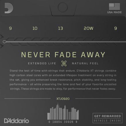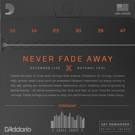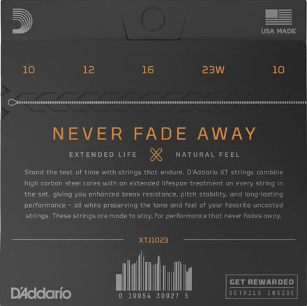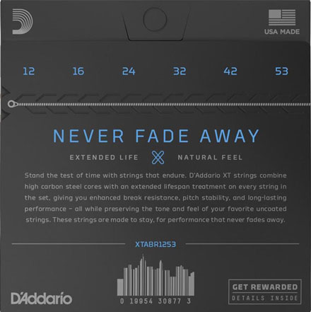 “Siga la prueba del tiempo con cuerdas que perduran. LAS CUERDAS D’ADDARIO XT COMBINAN NÚCLEOS DE ACERO DE ALTO CARBONO CON UN TRATAMIENTO DE LARGA DURACIÓN EN CADA CUERDA DEL JUEGO, LO QUE LE PROPORCIONA UNA MEJOR RESISTENCIA A LA ROTURA, ESTABILIDAD DEL CAMPO Y RENDIMIENTO DURADERO, TODO MIENTRAS CONSERVA EL TONO Y LA SENSACIÓN DE SUS CUERDAS SIN RECUBRIMIENTO FAVORITAS. Estas cuerdas están hechas para permanecer, para un rendimiento que nunca desaparece".