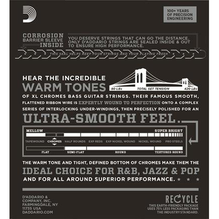 Las cuerdas de graves Flatwound de D'Addario, superventas, son conocidas por su tono cálido y suave y su tacto suave y pulido. Los cromos ofrecen un extremo inferior profundo y rico que los convierte en la opción de herida plana de los músicos de jazz, R&B y pop. Se adapta a graves de larga escala con una longitud de escala de cuerda de hasta 36-1/4 pulgadas.