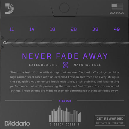 "Siga la prueba del tiempo con cadenas duraderas. Las cuerdas D'Addario XT combinan núcleos de acero con alto contenido de carbono con un tratamiento de larga duración en cada cuerda del juego, lo que te proporciona una mejor resistencia a la rotura, estabilidad del campo y rendimiento duradero, todo mientras conservas el tono y la sensación de tus cuerdas sin recubrimiento favoritas. Estas cuerdas están hechas para permanecer, para un rendimiento que nunca desaparece".