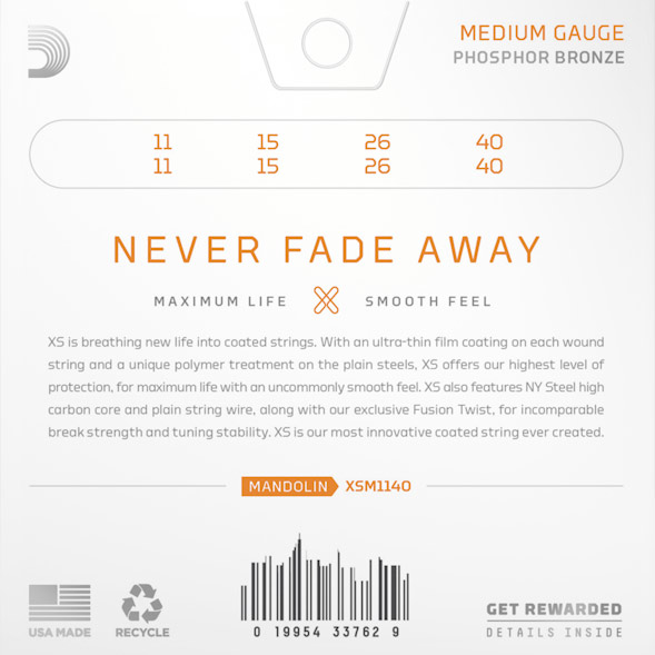 "Las cuerdas de mandolina D'Addario XS combinan nuestra aleación acústica más popular con nuestra tecnología de revestimiento de cuerda más avanzada, lo que da como resultado un tono claro, un tacto suave y una estabilidad de ajuste superior, todo con la vida de cuerda más larga posible".