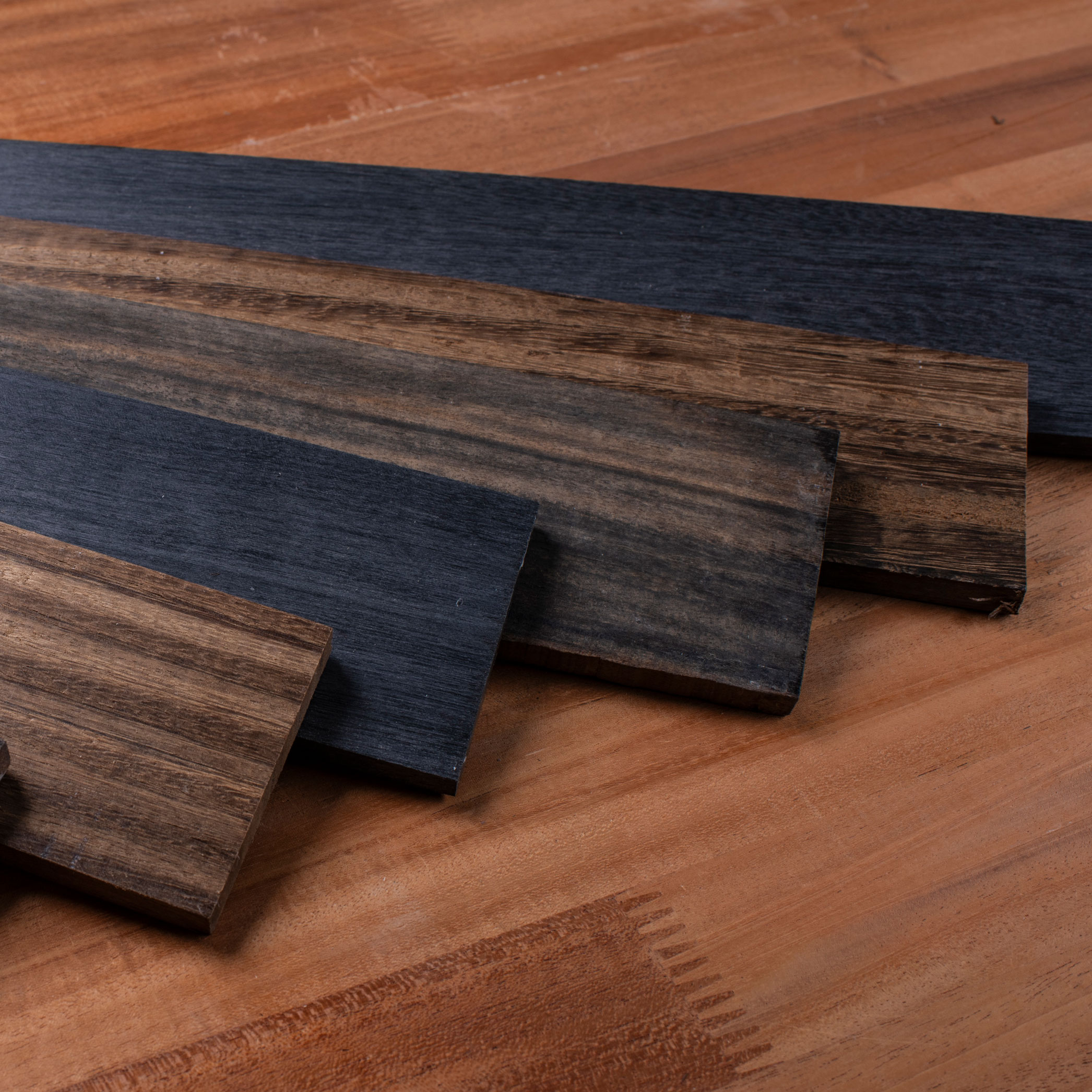 Nuestro ébano (Diospyros crassiflora) proviene de África Occidental y tiende a ser más uniformemente negro de lo que hemos visto de otras fuentes; sin embargo, la mayoría del ébano africano no es perfectamente negro azabache, la mayoría de las tablas tienen granos visibles y vetas ocasionales de grises y tostados. Creemos que estas variaciones visuales ofrecen carácter y mejoran la estética de la mayoría de las guitarras, pero si deseas un aspecto perfectamente oscuro, considera usar nuestro tinte Black Diapasón Stain para oscurecer la tabla y crear el efecto visual deseado.