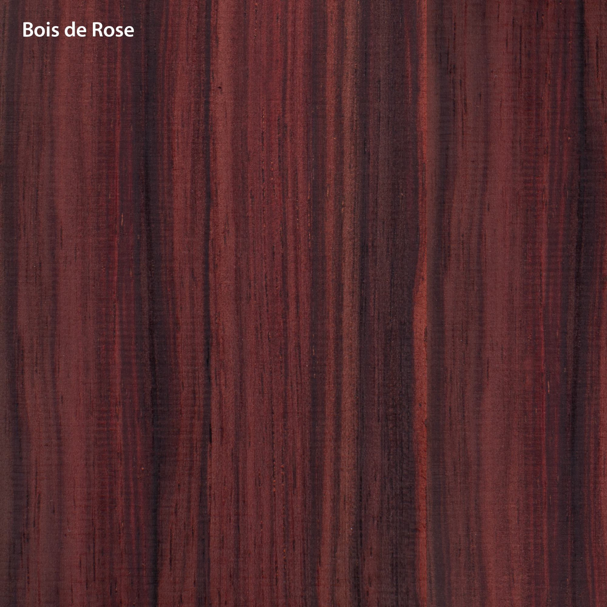 Rico y complejo tanto en tono como en color, Bois de Rose (Dalbergia maritima) es una madera de tonos muy rara y muy especial. Aunque es un auténtico rosewood de Madagascar, es distinto del más conocido Rosewood de Madagascar (Dalbergia baronii). Esta madera muestra un color rojo vino intenso que se oxida hasta convertirse en un tono oscuro de morado, que recuerda a una berenjena. Gracias a nuestra asociación con Madinter en España, podemos obtener legalmente esta extraordinaria madera para nuestros clientes de EE. UU.