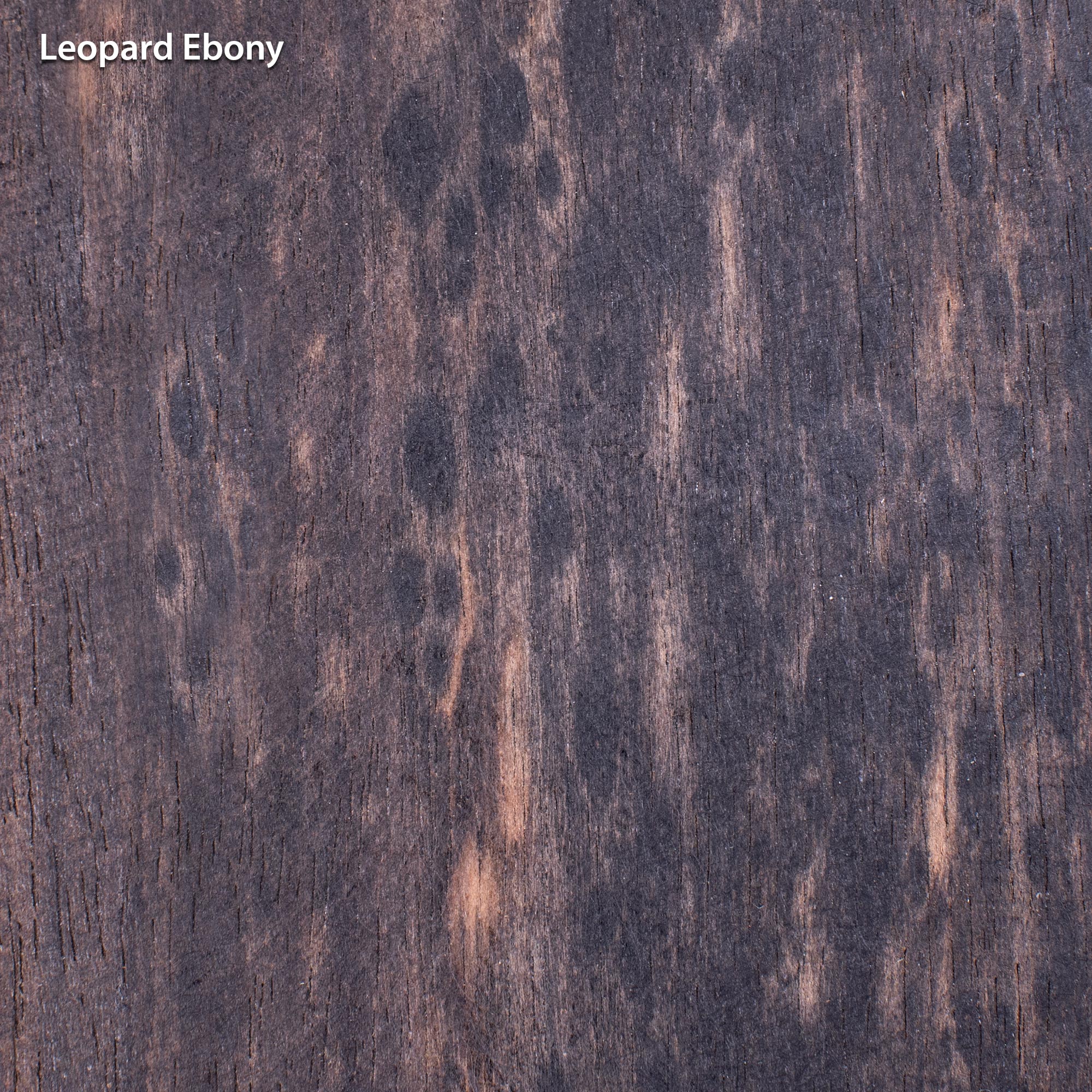 Un look atrevido con el mismo tono y tacto legendarios. El ébano leopardo es una sorprendente variación visual del mismo ébano africano (Diospyros crassiflora) en el que hemos confiado durante años. Lo que lo diferencia es su espectacular figura: patrones de grano ondulado y moteado que se asemejan al gato grande homónimo. Aunque es visualmente salvaje, sigue mecanizando con belleza, termina sin problemas y ofrece los densos y articulados generadores de tonos en los que confían. Si buscas algo un poco más distintivo, sin sacrificar la sensación o el rendimiento del ébano tradicional, esta tabla es la elección perfecta.