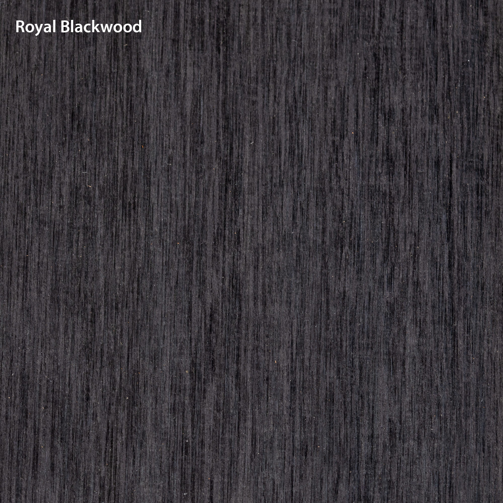 Royal Blackwood es creado por la torreficación de Purpleheart (Peltogyne catingae). Este proceso cambia el color de la madera a negro puro, mientras mantiene su grano natural y su manejabilidad. A diferencia del tinte, el color negro es uniforme en toda la pieza y no reacciona a pegamentos, humedad ni disolventes. Con una densidad entre el ébano y el romero indio, es ideal para los dedos. Muchos constructores lo utilizan en lugar de ébano por su color y sensación notablemente similares sin las restricciones de exportación.