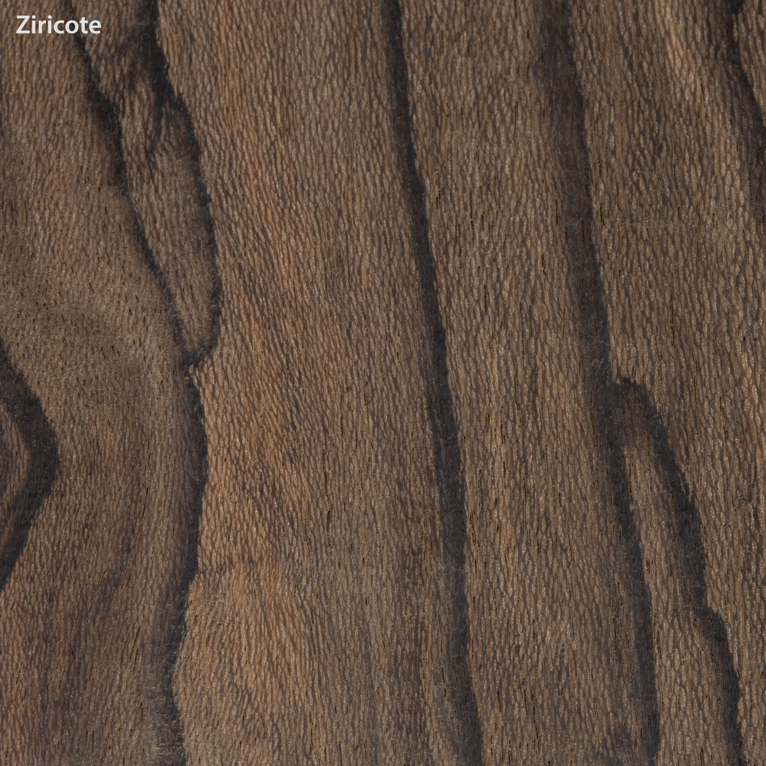 Ziricote (Cordia dodecandra) es una de las maderas de tonos más impresionantes visualmente disponibles en la actualidad. Su preciosa figura "mármolada" o "web de araña" le da un aspecto totalmente único a cualquier construcción. También tiene una gama increíblemente diversa de colores: las líneas negras oscuras prominentes a menudo se entrelazan maravillosamente con tonos de gris, dorado, verde y marrón oxidado. Es más pesado que la mayoría de los Rosewoods y funciona como el ébano.