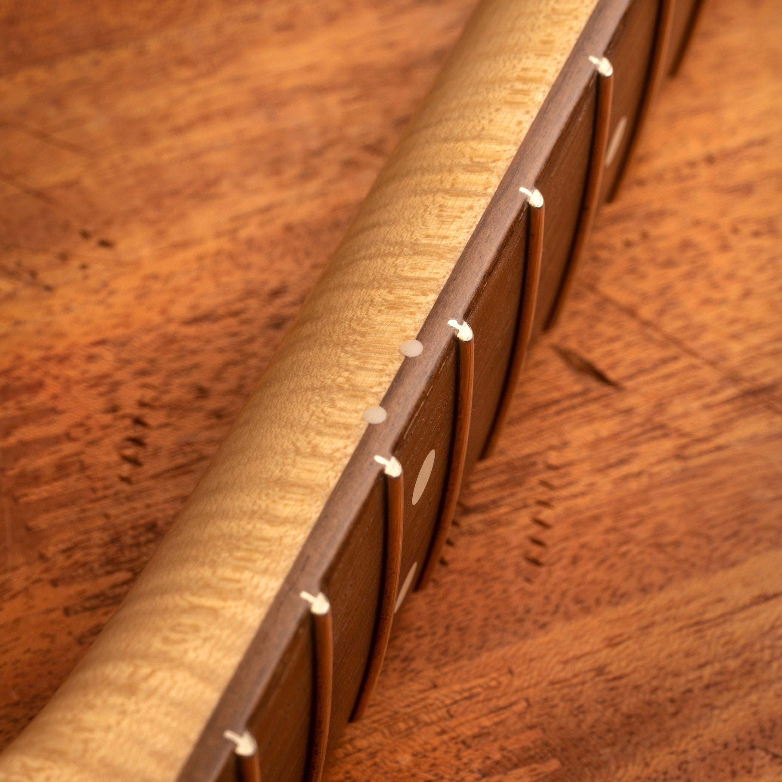 Otras características incluyen un diapasón de palisandro con radio de 9,5 in, 22 trastes estrechos, cejuela de hueso y un acabado de uretano satinado en la parte posterior. La cejuela de hueso está ranurada previamente con ranuras de ubicación de cuerda "piloto" para facilitar la configuración final.