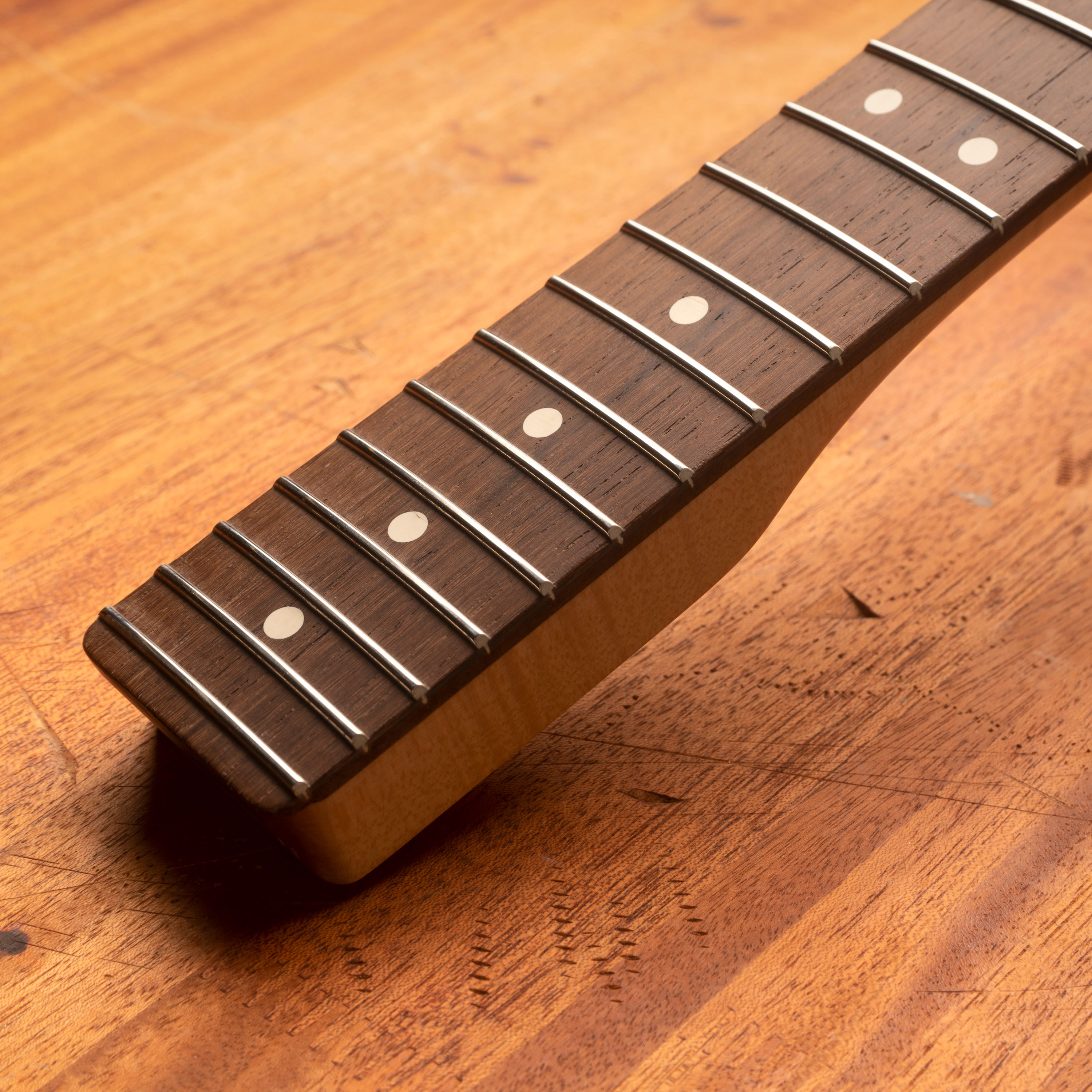 Debido a que los cuellos de repuesto originales de Fender no se han montado en cuerpos de guitarra, es necesario realizar pasos finales como perfeccionar las ranuras de la cejuela, realizar trabajos de trastes, ajustar el mástil a la cavidad del mástil y otros procedimientos de configuración del instrumento para una facilidad para tocar óptima. Este mástil de repuesto es para una guitarra Fender o Squier by Fender.