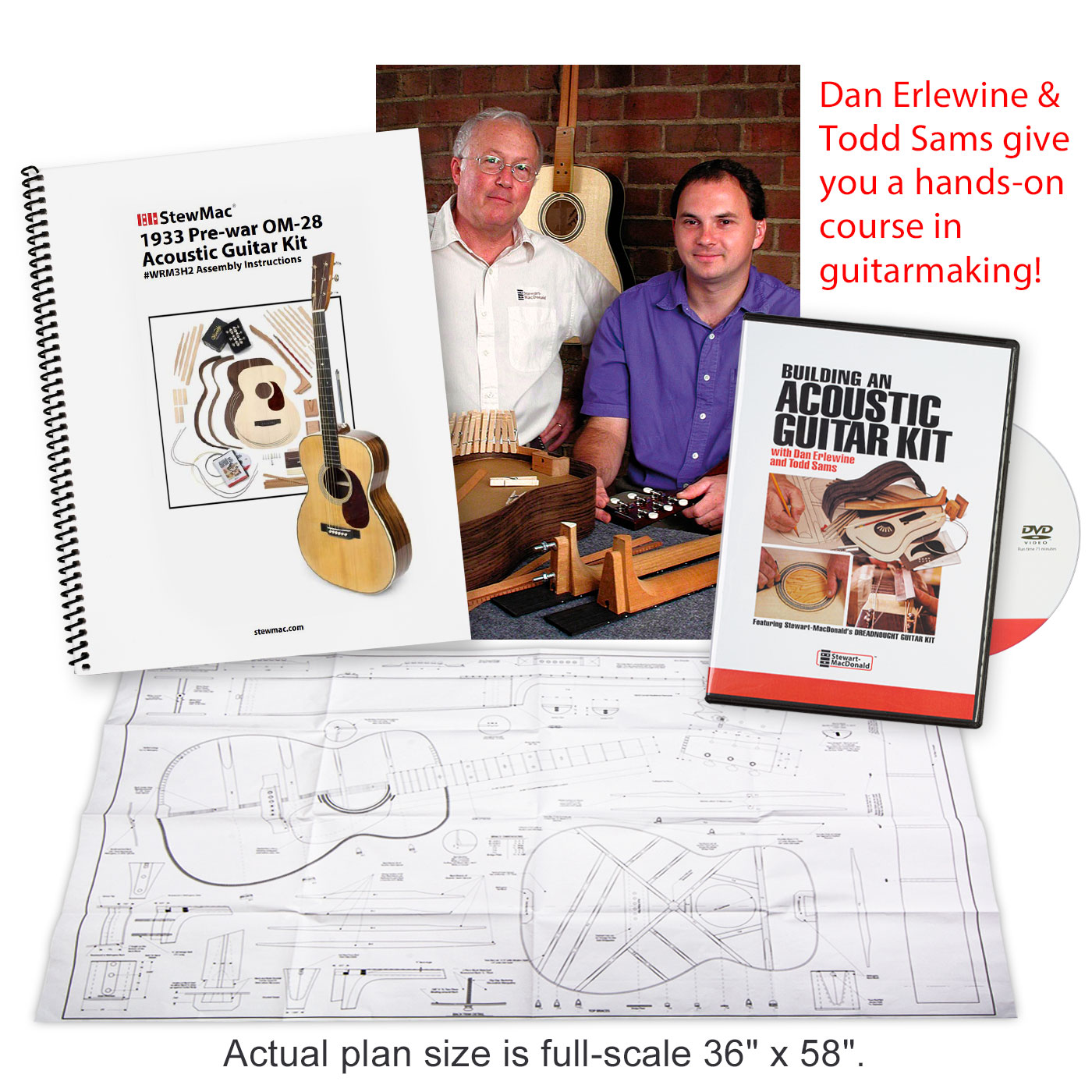 Este kit también incluye nuestro mejor servicio al cliente del sector. Nuestros técnicos están a su disposición para responder cualquier pregunta que tenga durante su construcción. También incluimos un DVD de 71 minutos que es un curso completo en la construcción de guitarras y un plano de varetaje y un plano de varetaje a escala completa para que tengas el conocimiento y la confianza necesarios para terminar esta construcción con facilidad.
