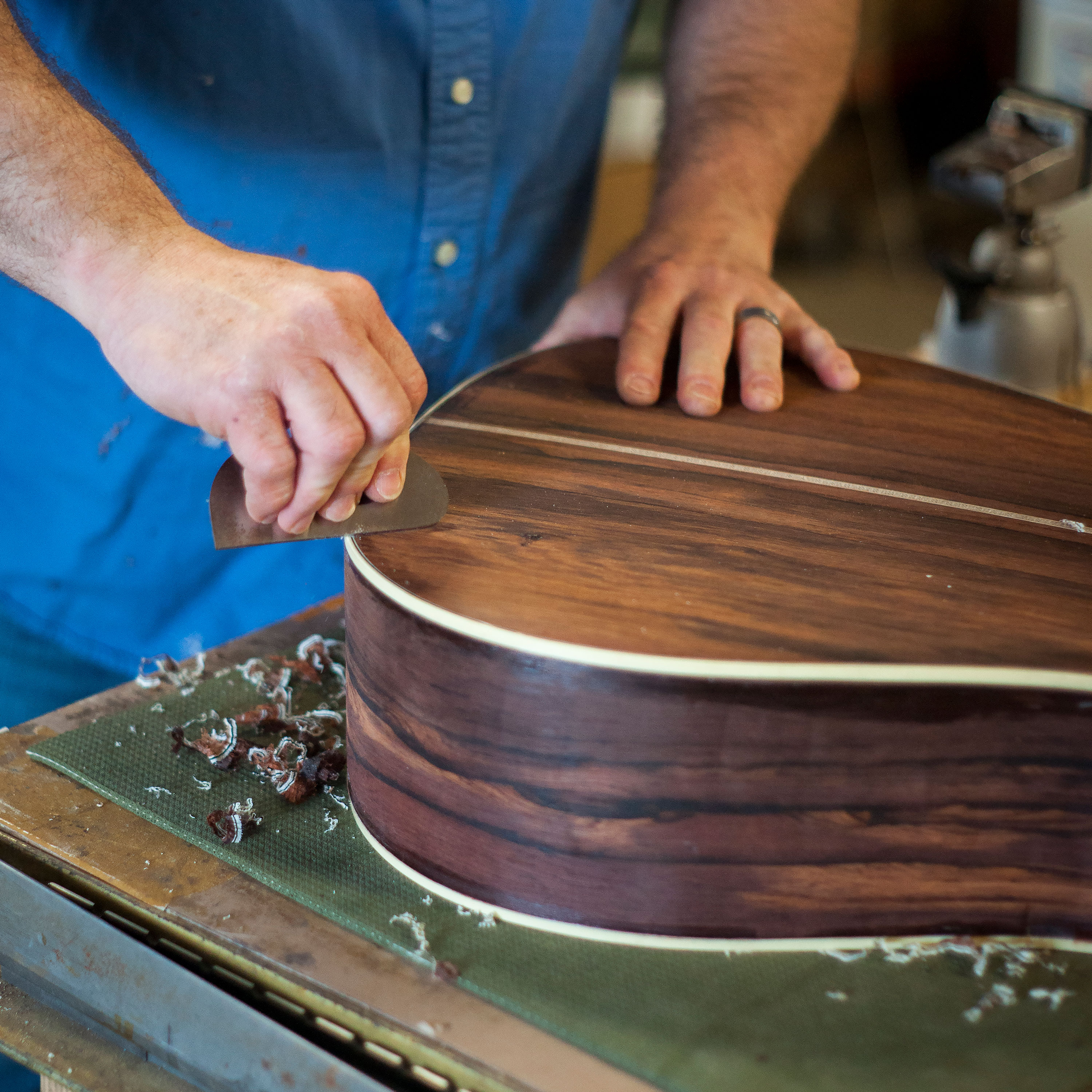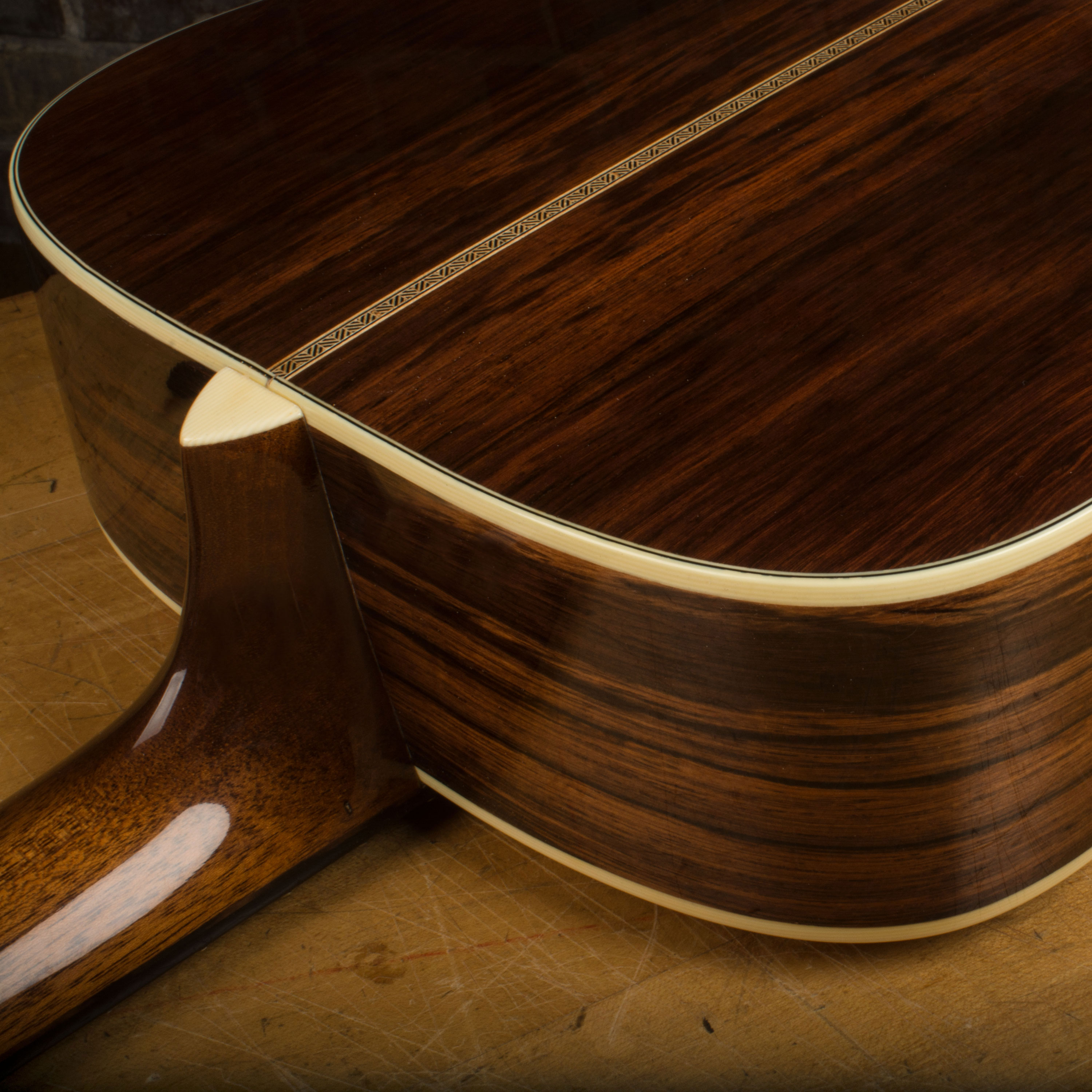 También reproducimos meticulosamente todas las pequeñas cosas: coincidimos con la binding celuloidal del ivoroide lo más cerca posible e incluimos incrustaciones de abulón reales como el original. Incluso incluimos la tela de queso que tapa la costilla en X y la cinta de tela usada en el día como refuerzos laterales.