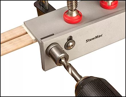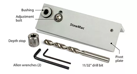 La plantilla de taladro de 5 tetones StewMac Banjo le ayuda a localizar y taladrar un orificio de montaje perfecto para un banjo típico de cinco cuerdas. La broca de 11/32" incluida con tope de profundidad garantiza el diámetro y la profundidad perfectos del orificio.