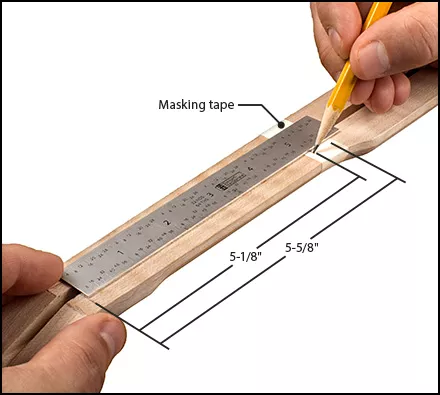 . Para medir desde el “punto cero” del tablero, donde el tablero entra en contacto con la tuerca, dibuje una línea de lápiz a 5-1/8” (130 mm) desde la tuerca. Haga una segunda línea a 5-5/8" (143 mm) de la tuerca.
