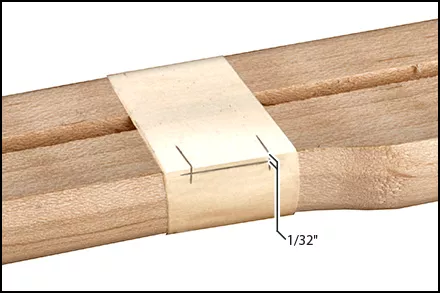 En cada uno de los dos puntos marcados anteriormente, extienda la línea hacia abajo en el lado del mástil. En cada punto, haga una marca de 1/32" (0,79 mm) debajo donde el diapasón se une al mástil. Si no hay diapasón instalado, como en nuestras fotos, sus marcas están 1/32" por debajo de la superficie del mástil.