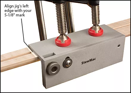 Alinee el borde de la plantilla con la marca de 5-1/8" en la superficie del mástil. Utilice dos abrazaderas para sujetar la plantilla firmemente en su lugar. Evite dañar el mástil utilizando madera u otro material protector entre las abrazaderas y la parte posterior del mástil.