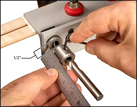 de la broca Inserte la broca en el casquillo hasta que la punta toque el mástil. Apriete el tope de profundidad de la broca, dejando un espacio de 1/2" (12,7 mm) entre el tope de profundidad y el casquillo. Este espacio de 1/2" es la profundidad del orificio que se va a taladrar.