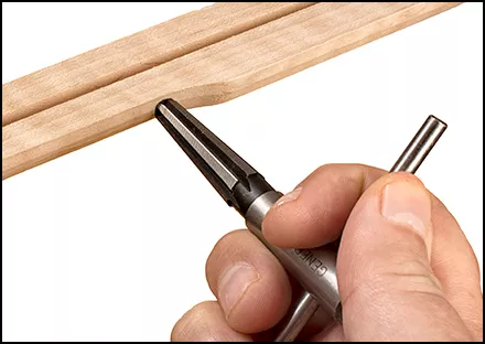 de 5.a cuerda más grandes La mayoría de los estilos de tetones de ajuste de 5.a cuerda presionarán en el orificio creado por la broca de 11/32". Si la 5.a clavija es más grande, termine el orificio con un escariador cónico de 5.a clavija para un ajuste ceñido.